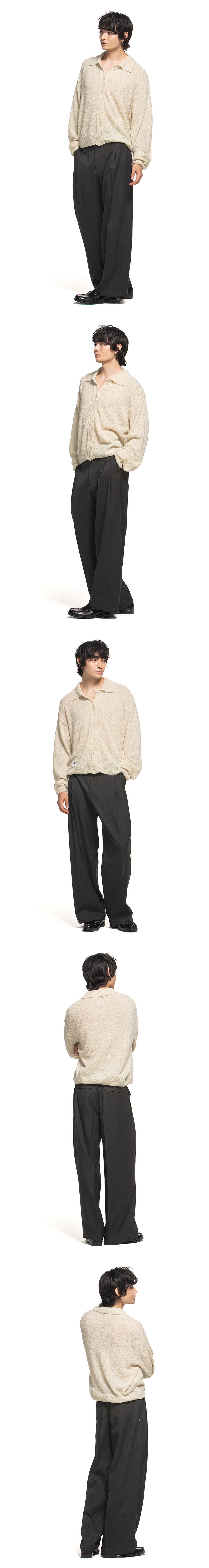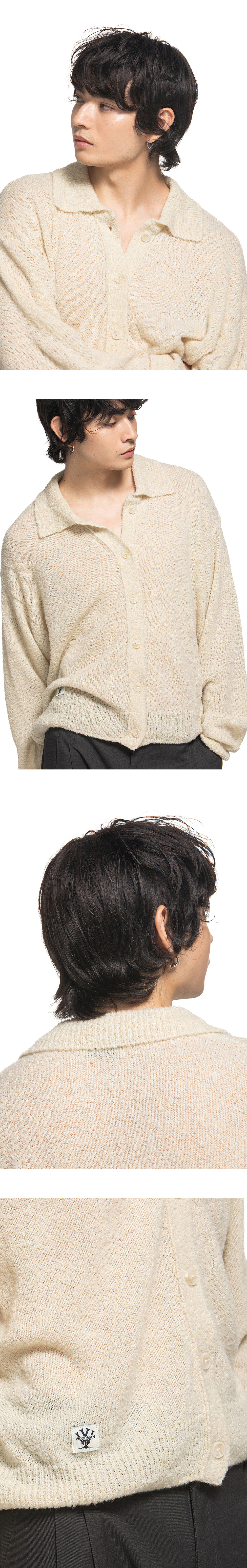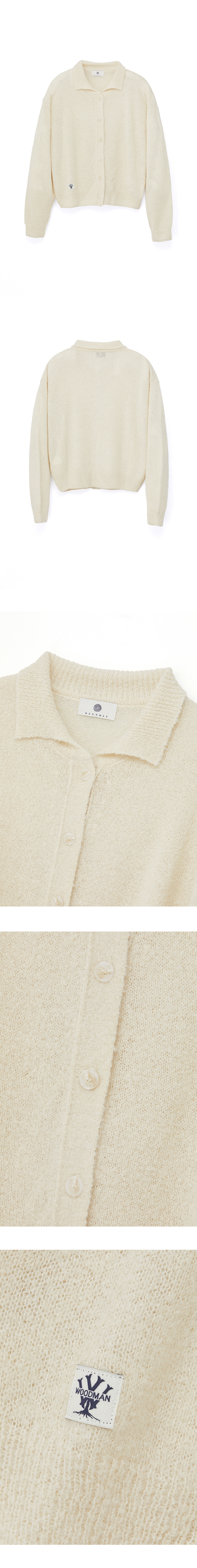 고리 모양 부클레 원사로 짜여진 카라 가디건 입니다. - 하단 우드먼 포인트 라벨 - 단추 우드먼 로고 음각
