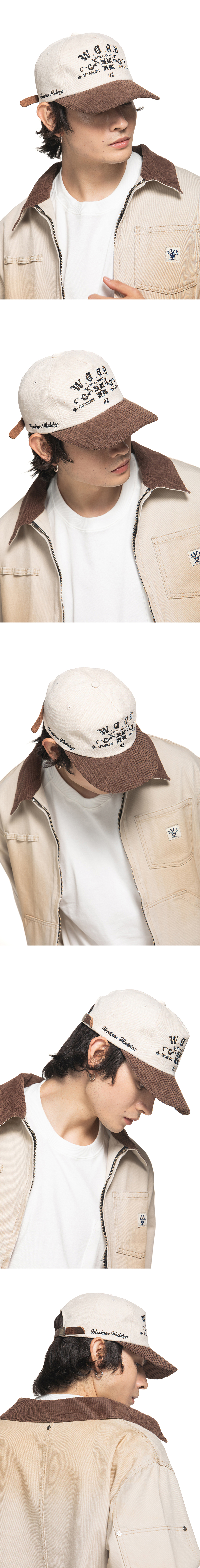앤틱한 그래픽과 두가지 원단의 조합으로 디자인된 볼캡 입니다. 일반적인 볼캡보다 살짝 더 깊고 넓은 핏으로 제작되었습니다. - 소가죽 모자 스트랩 - 우드먼 레이저 각인 모자 조이개