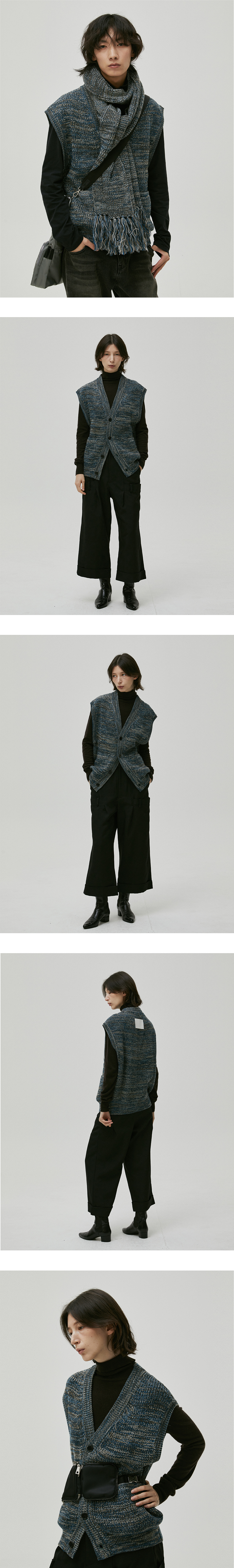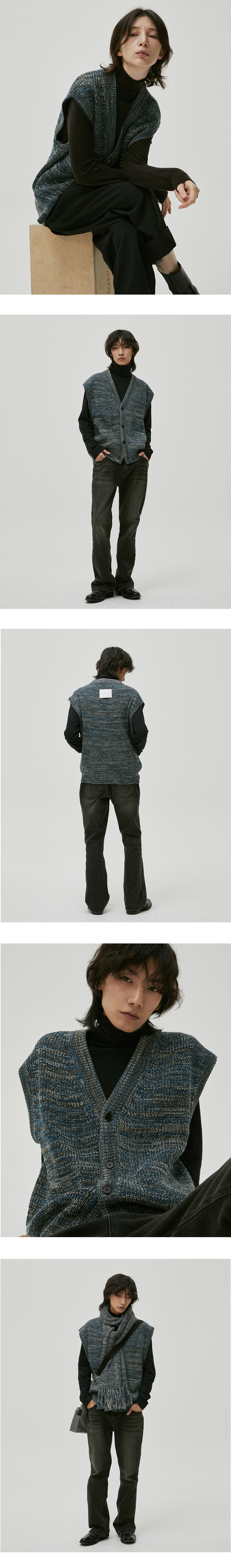 - 혼용율 Wool 20 Acrylic 70 Nylon 10 - 루즈핏 (여성은 S, 남성은 M/L 추천) - 블루, 그레이, 브라운, 아이보리 칼라 믹스 - 뒷면에 가죽패치 (화이트), 앞 소뿔단추 - 멀티칼라 롱 머플러와 세트