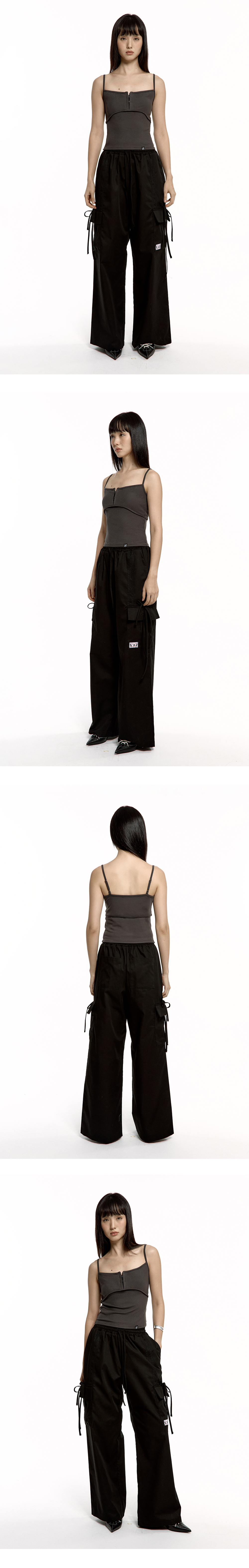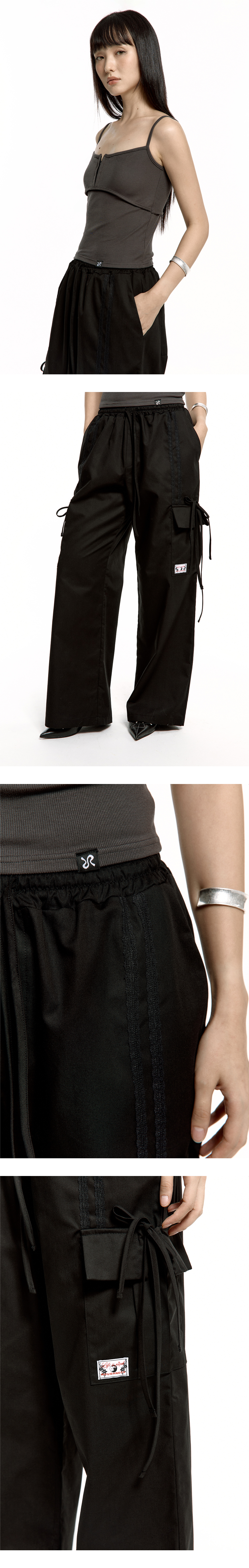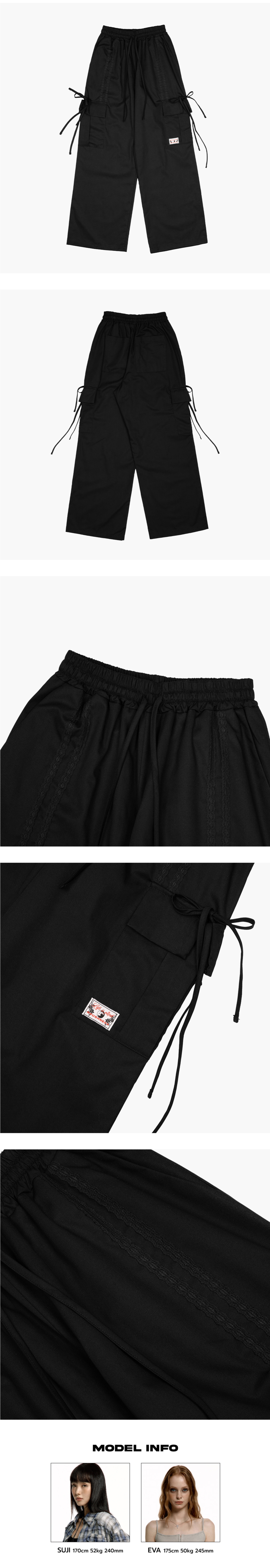 세미 와이드 핏의 카고 팬츠입니다. 허리가 밴딩으로 되어있어 편안한 착용감을 제공합니다. 허벅지에 동일한 색상의 레이스로 테이핑 디테일을 주었으며 주머니의 독특한 절개 리본 디테일이 매력을 더합니다. 다양한 형식으로 스타일링이 가능하며 살짝 두께감 있는 원단을 사용하여 비침 없이 착용 가능합니다. - Cotton 35% Poly 65% - Model Info : Suji 170cm 52kg - Fitting size : FREE