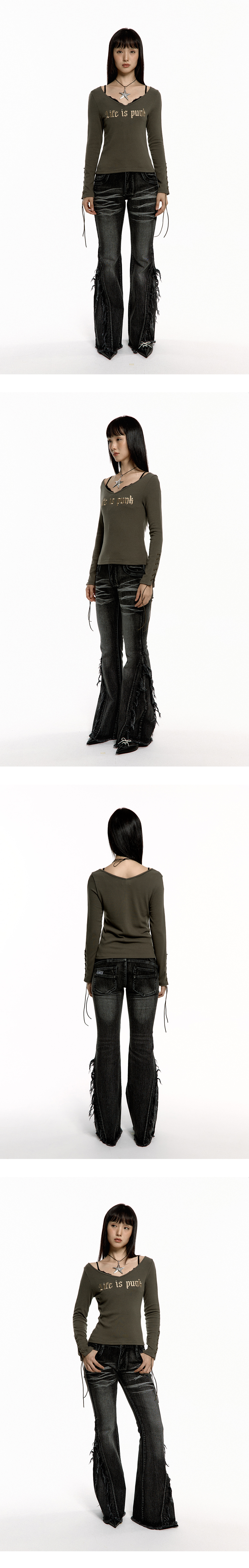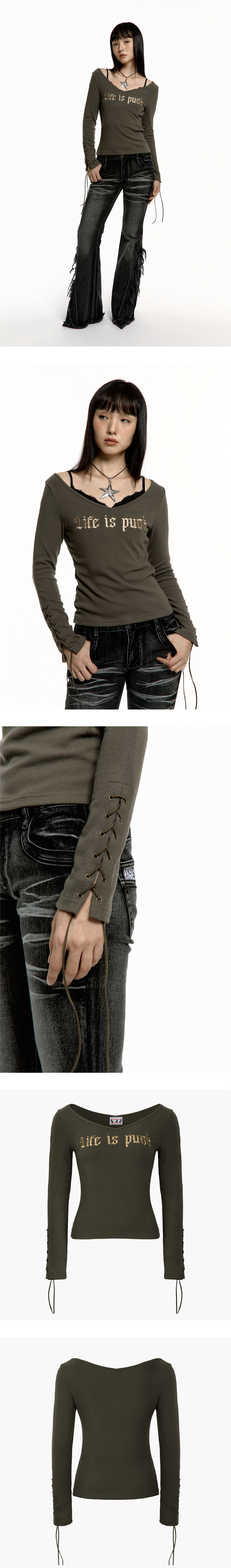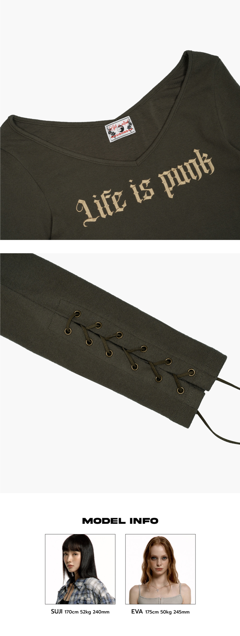 기모가 겉으로 나와있는 독특한 원단으로 제작되었습니다. 깊은 V넥의 티셔츠로 목이 길어보이는 효과와 더불어 이너를 착용하여 레이어드 룩으로 연출이 가능합니다. 가슴의 ‘Life is punk’ 문구 자수와 소매의 아일렛과 스웨이드 끈으로 러프넥의 감성을 더했습니다. - Poly 62% Rayon 34% Span 4% - Model Info : Suji 170cm 52kg - Fitting size : S