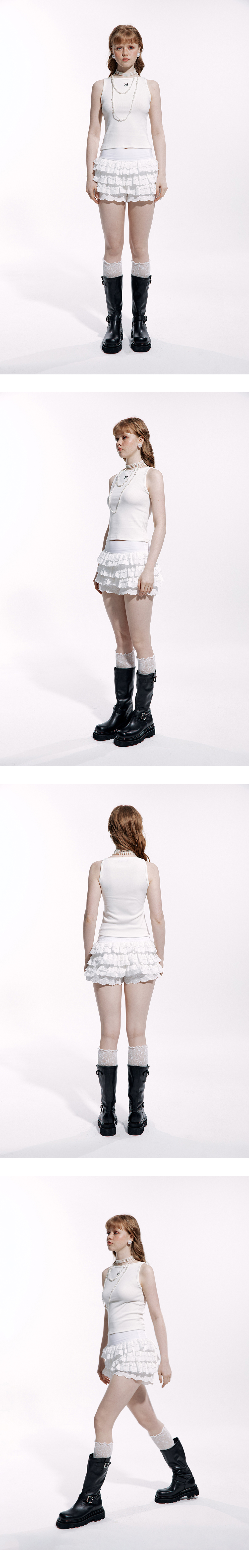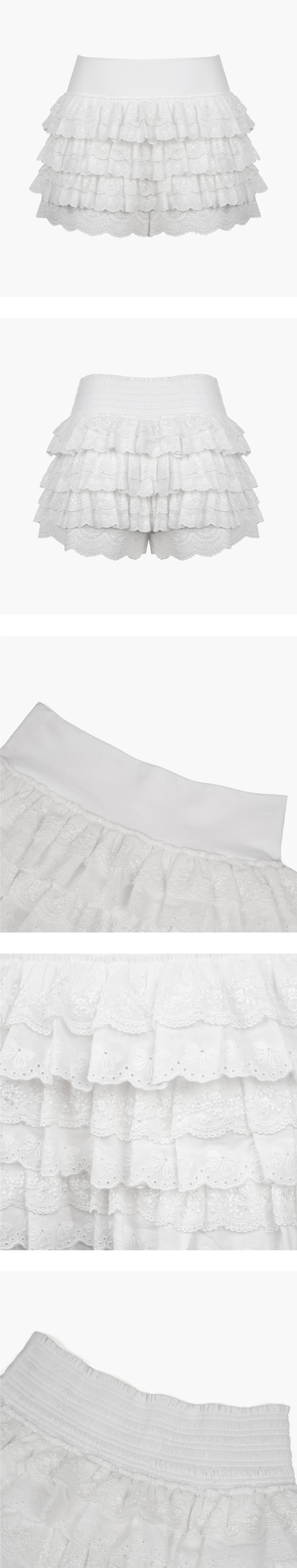 각기 다른 패턴의 세가지의 레이스를 사용하였습니다. 레이스의 원단 또한 모두 달라 볼륨감과 패턴의 어울림 또한 오랜 시간 고려하여 제작했습니다. 안에 속바지를 내장하여 활동성 또한 좋으며 짧은 길이에도 부담감 없이 착용 가능합니다. 허리와 배를 감싸주는 하이웨스트 형식이며 앞과 뒤 모두 밴딩 형식의 스판 원단이기에 모든 체형이 착용 가능합니다. *Model size : 175m 55kg 착용사이즈 : FREE *Material : Polyester 100%