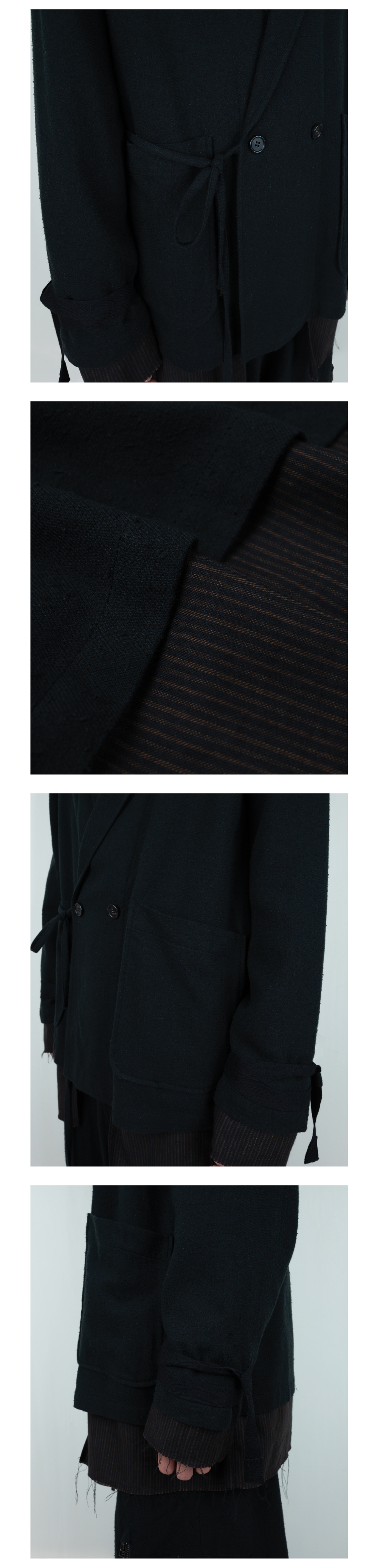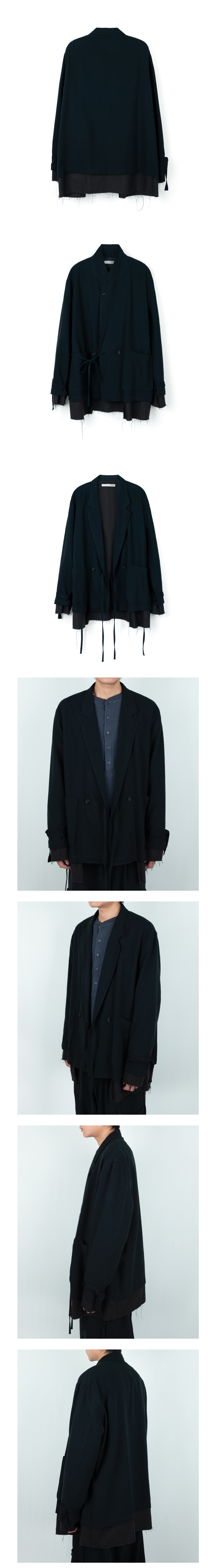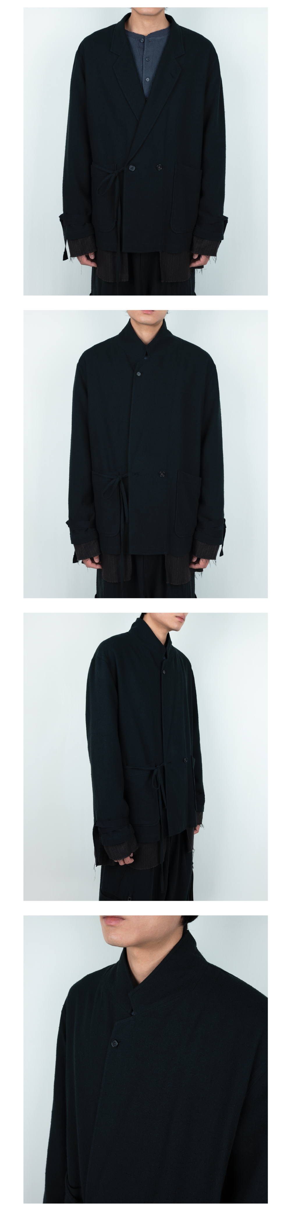 No. AY-JK06 - 더블 브레스티드 재킷을 원형으로 레이어드 된 재킷 - 겉감을 ARINOBE 社의 코튼과 노일 실크가 혼방된 원단으로 자연스러운 얼룩과 넵으로 인해 유즈드 한 느낌의 원단 - 레이어드 되는 안감은 코튼과 텐셀이 혼방된 원단으로 은은한 광택감이 도는 MARUWA 社의 원단을 사용 - 적당히 레이어드 되는 기장감으로 안감을 노출 - 유즈드 한 느낌의 겉감과 맞추어 컷 오프로 마감 - 앞단과 옆선에 제 원단 끈을 길게 늘어트려 묶을 수 있고 소매 부리에는 끈으로 손목을 감아 연출 - 겉감, 안감 모두 드레이프성이 좋은 원단이기에 몸에 감기는 착용감 - 라펠 홀 버튼 디테일 MADE IN KOREA MODEL 176cm Wearing Size 3 Color Black Material Shell : Cotton 58%, Silk 42% (ARINOBE社 Japanese Fabric) Lining : Cotton 51%, Tencel 49% (MARUWA社 Japanese Fabric)