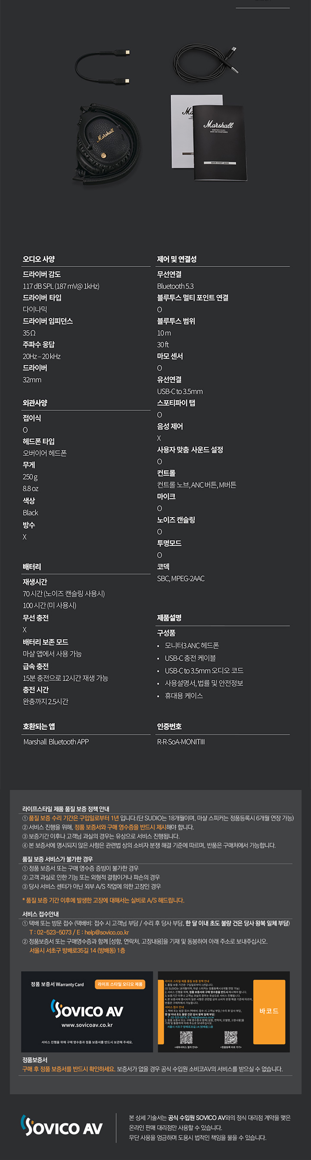 마샬 모니터 3 A.N.C 블랙 (소비코 AV 정식 발매 제품)