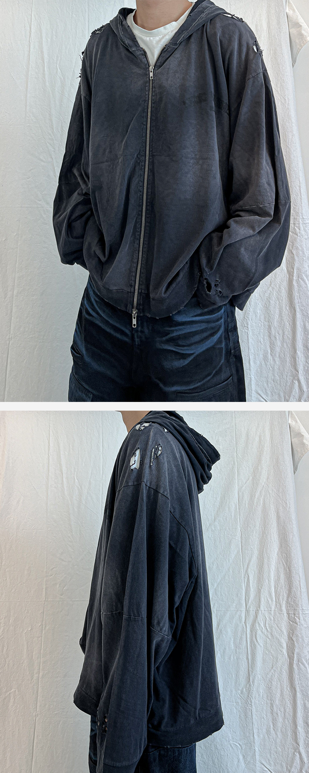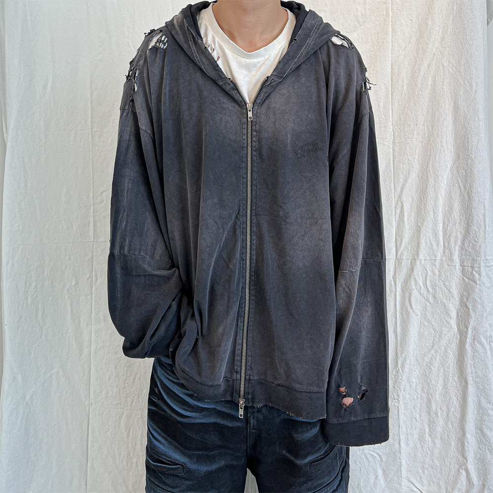 - 루즈 핏 - 빈티지 가먼트 다잉, 가먼트 워시 - 레터링 프린트 - 투웨이 지퍼