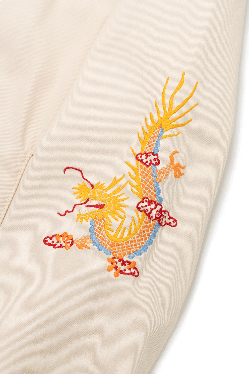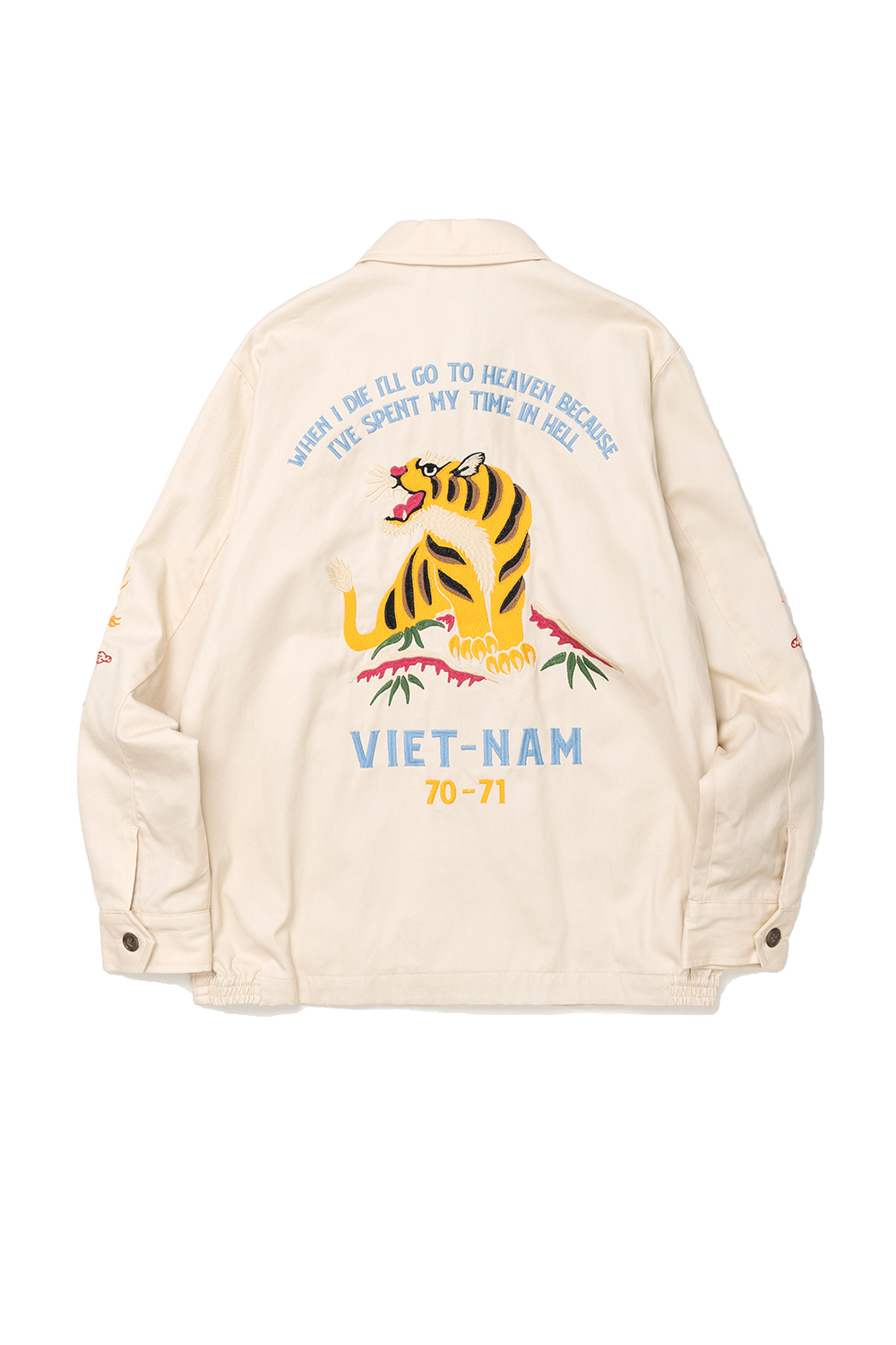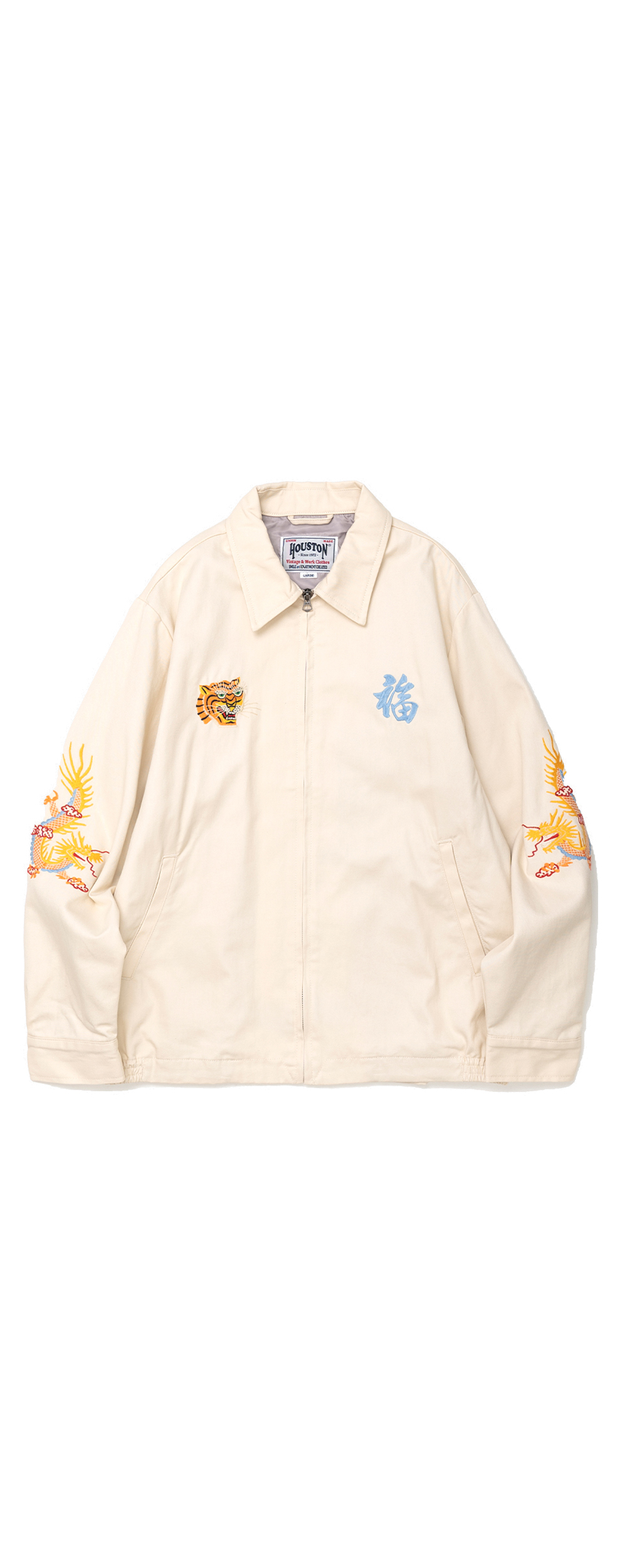 Houston Japan 51350 Cotton Vietnam Jacket (Tiger) - Off White 화려한 컬러감의 코튼 능직을 사용하여 제작된 베트남 자켓입니다. 프론트는 집업 사양이며, 가슴의 양측으로 호랑이의 얼굴과 한자 복(福)이 자수되어 있습니다. 소매 역시 용의 자수가 디자인 되어 있으며, 싱글 버튼의 소맷단은 롤업에 용이합니다. 양측의 슬레쉬 포켓과 내부 좌측의 포켓이 있어 수납에 용이합니다. 후면부의 중앙에는 큰 형태의 호랑이 자수가 되어 있습니다. * Upper : Cotton 100% * Lining : Polyester 100% * 빛에 의한 제품의 색감 차이가 존재 할 수 있습니다. * Made in China