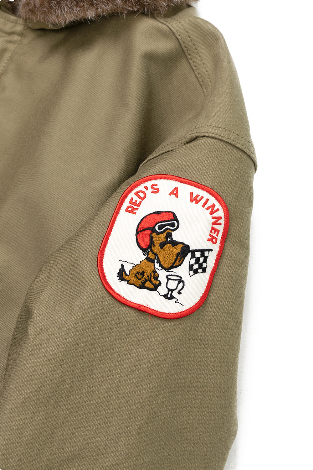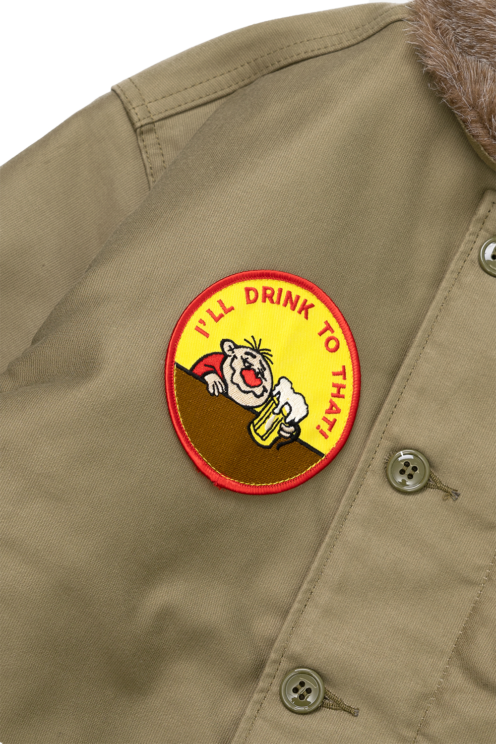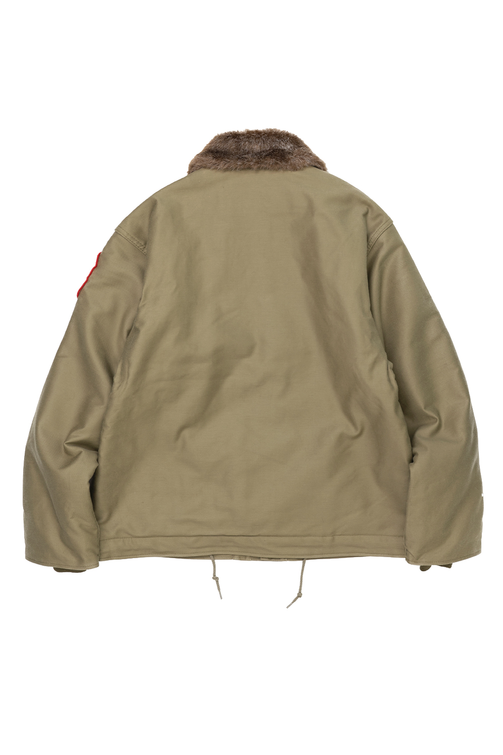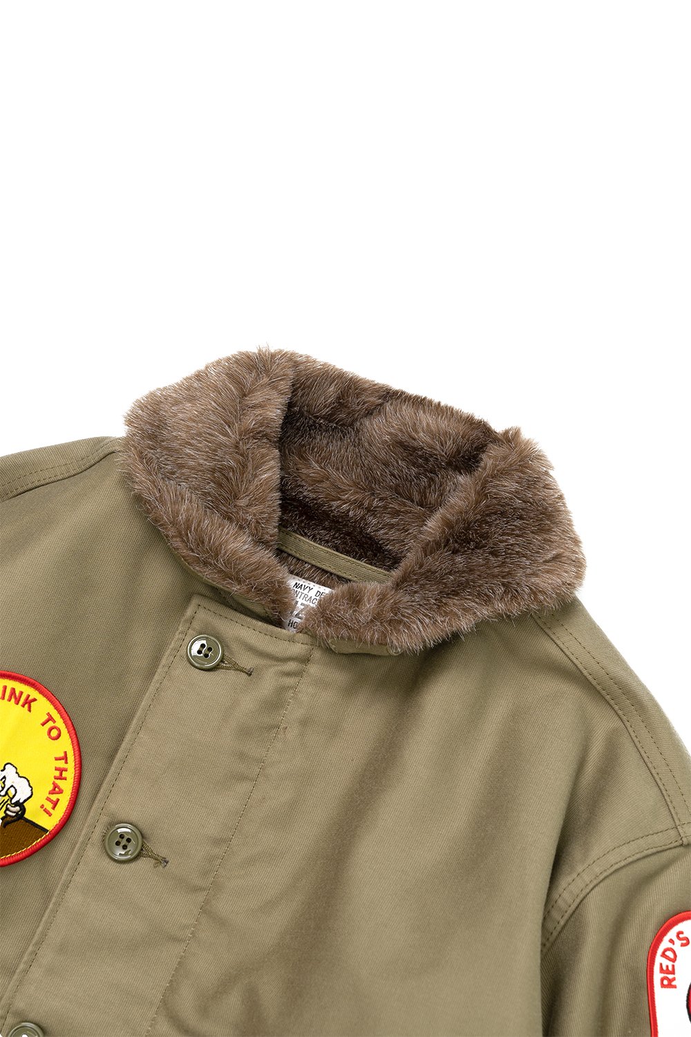 Houston Japan 51424 Custom N-1 Deck Jacket (Beer) - Tan N-1 Deck Jacket의 커스텀 시리즈입니다. 두껍고 튼튼한 헤비 피케원단으로 제작된 덱자켓입니다. 안쪽 전면에 보아털이 붙어 있어 높은 보온성을 가지고 있습니다. 목부분은 N-1의 상징이기도한 보아털 카라이며, 카라 뒷면에 달린 버튼식 친스트랩으로 고정하면 보아가 목을 감싸 더 높은 보온을 유지할 수 있습니다. 전면은 IDEAL사(社)의 지퍼 위에 두껍고 튼튼한 플랩이 배치된 플라이프런트 형식입니다. 소매는 튜브리브 형식이며 겨드랑이 부분에는 환풍을 위한 4개의 벤틸레이션이 있고 안감에는 땀에 의한 손상을 방지하기 위해 별도의 천이 덧대어 있습니다. 왼쪽 가슴에는 USN 스텐실이 있고 손을 넣기 쉽도록 사선의 슬러시 포켓이 배치되었습니다. 밑단 부분에는 품을 조절할 수 있는 끈이 있습니다. 코믹한 2종류의 패치를 배치했습니다