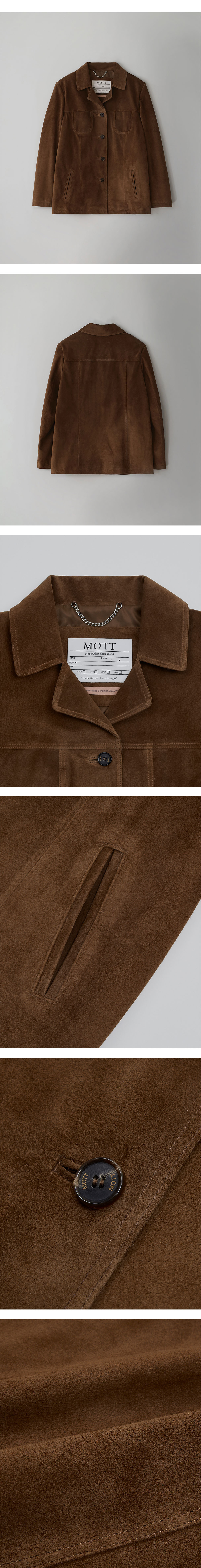 - 리얼 돈피 Hogleather 100%, 천연 소재의 스웨이드 - 표면이 고급스럽고 소프트한 소재감의 프리미엄 자켓 - 스탠다드 클래식 라인의 핏 - 리얼소재에 후가공을 통해 탄탄하게 제작된 돈피로 매끄럽고 안정감 있게 떨어지는 핏 - 견고한 봉제와 전체 더블스티치 마감 - 가슴 포켓 디테일 - 안감 속주머니 - 소뿔 단추 - 체인 라벨 - 프런트 4버튼의 여밈 구조