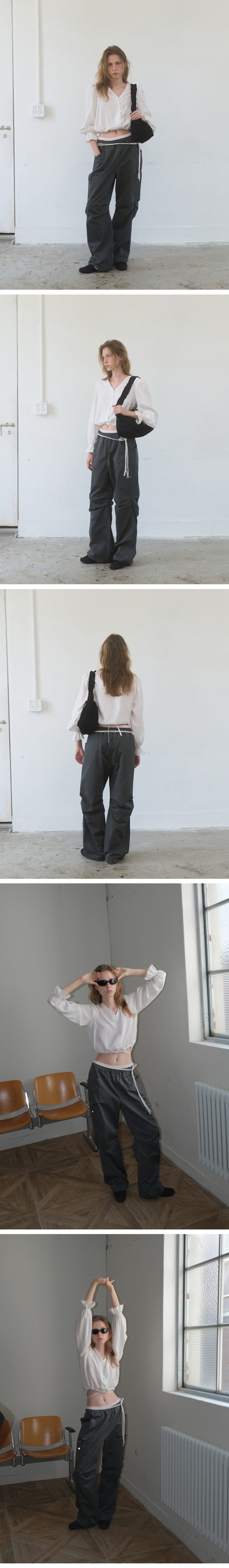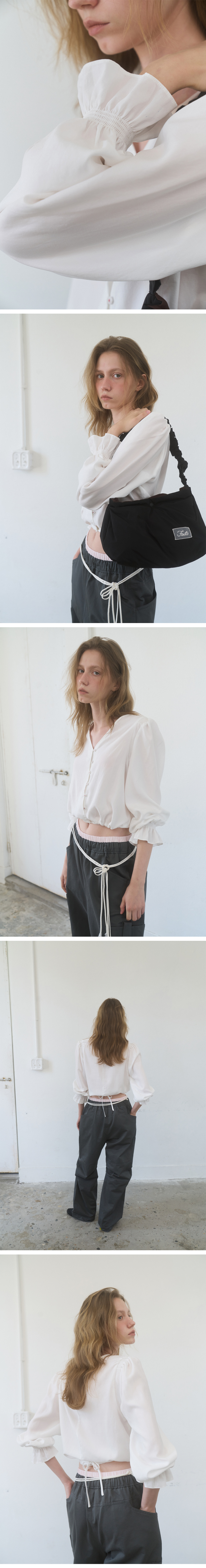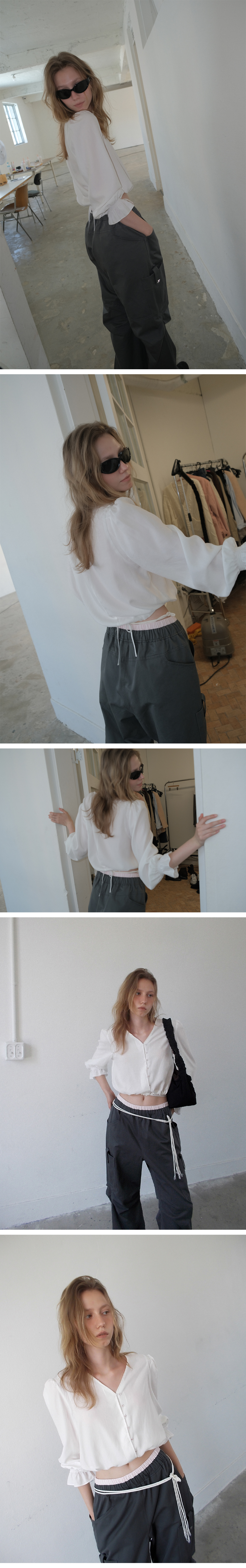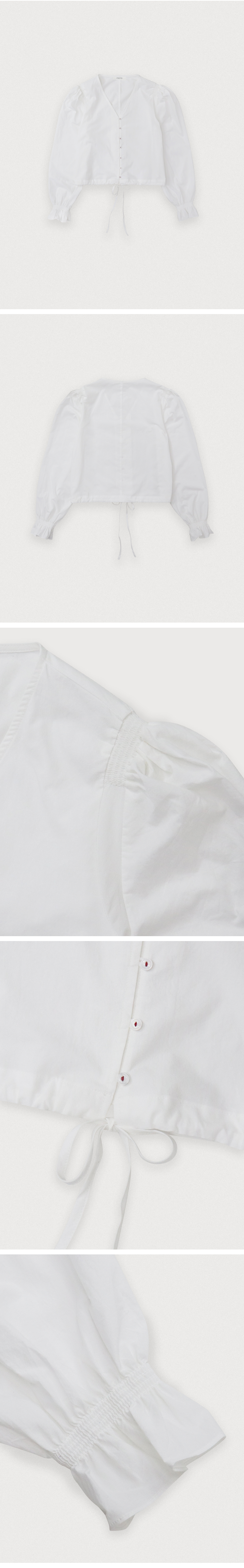 일상 속에서 가볍게, 하나하나의 조각들이 모여 완성한 "Foto dump” 컬렉션을 잘 나타내 주는 쿨한 무드의 크롭 블라우스입니다. 가볍고 산뜻한 코튼 소재로 제작되어 간절기 시즌 룩으로 적합합니다. 숄더와 암홀 사이에 스모킹 밴딩 디테일로 볼륨감과 포인트를, 풍성하고 여유로운 소매를 지나 스모킹 밴드로 한번 잡아주고, 소매 끝은 러플로 완성하여 쿨하면서도 사랑스러운 분위기가 물씬 느껴집니다. 넥 라인을 시원하게 만들어주는 브이넥 디자인과, 여유롭고 스탠다드한 핏 그리고 밑단은 스트링으로 실루엣과 기장을 조절해 모델 피팅처럼 뒤로 리본업을 해도, 앞으로 리본을 묶어 러블리하게 착용하셔도 좋습니다. 앙증맞은 버튼들은 레드 컬러의 실을 사용하여 달아주어 인상적인 포인트가 되어주었으며 바디 안쪽 히든 버튼 단작 디테일을 더해 안쪽 살 노출 부담을 덜었습니다.