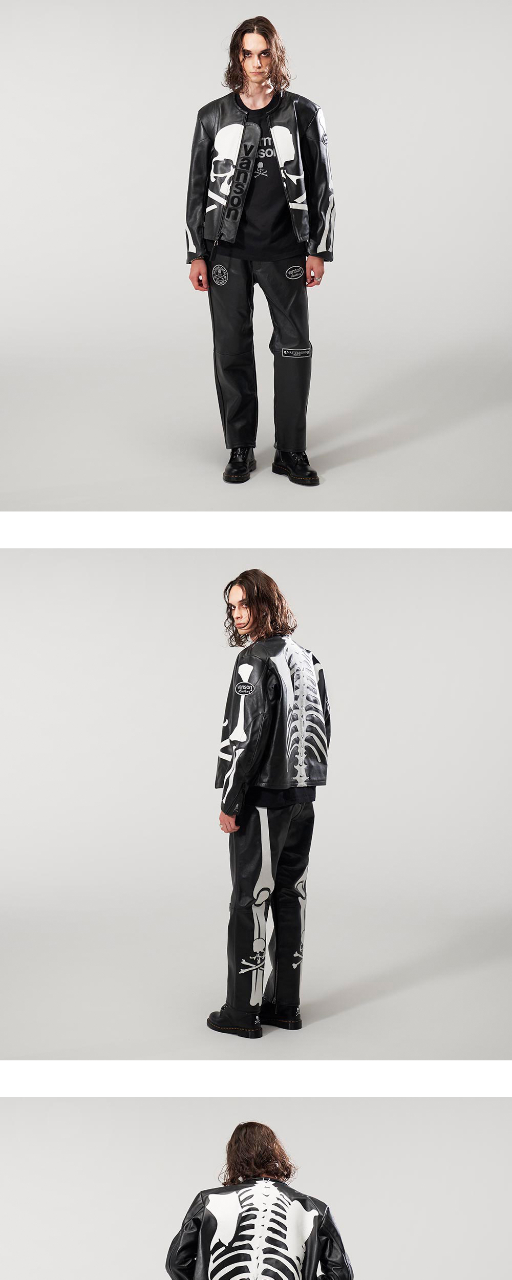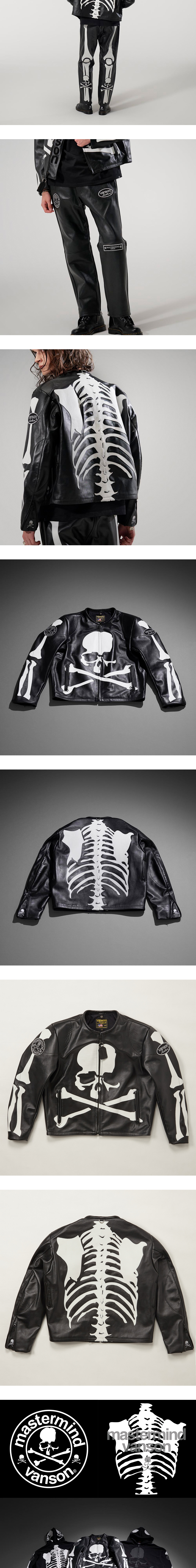 마스터마인드의 스컬과 밴슨의 스켈레톤의 만남, 마스터마인드 월드 x 밴슨의 레더 자켓입니다. - 리얼레더 및 메탈 부자재 - 전면 스컬 자수 패치 - 후면 스켈레톤 자수 패치 - 소매 로고 자수 패치 및 스켈레톤 레더 패치 - 소매 스컬 로고 자수 - 소매 지퍼로 실루엣 조절 가능 - 지퍼 택 키링 디테일