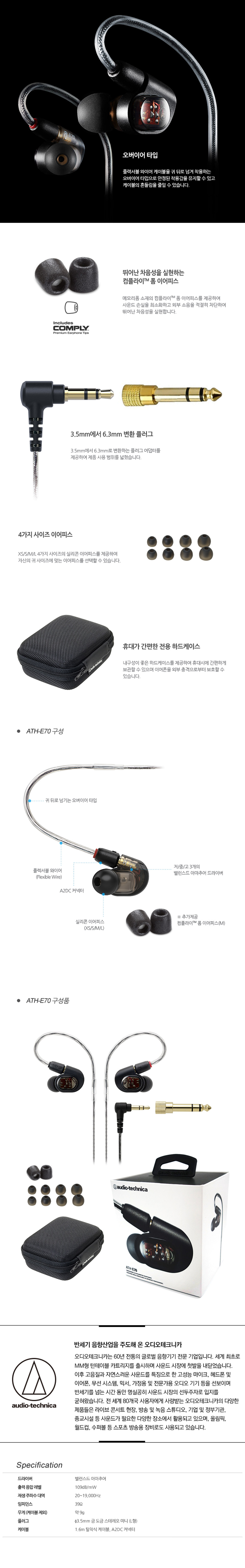 오디오테크니카 ATH-E70 트리플 밸런스드 아마추어(BA) 드라이버 모니터링 이어폰