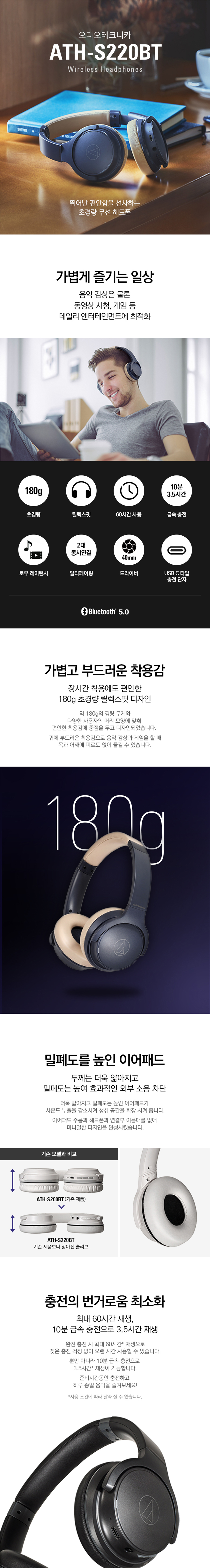 오디오테크니카 ATH-S220BT 초경량 무선 블루투스 온이어 헤드폰 60시간 연속재생 블랙