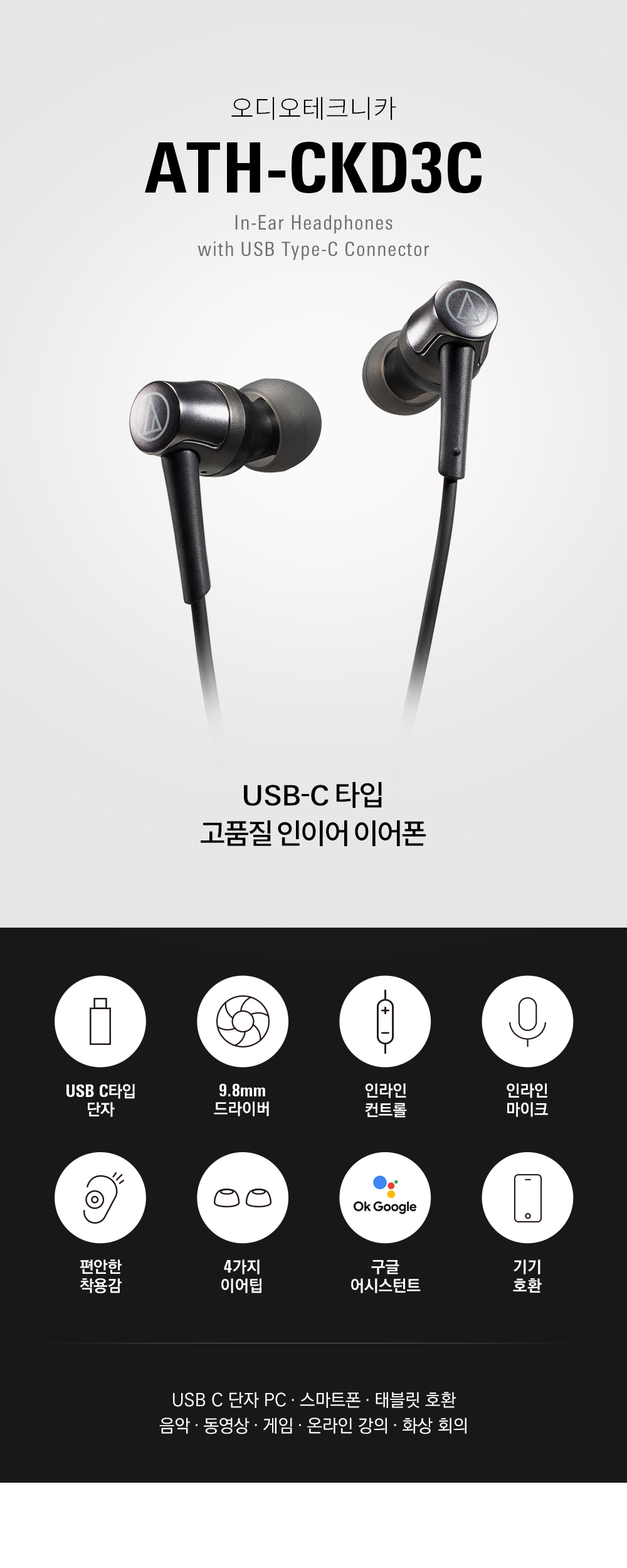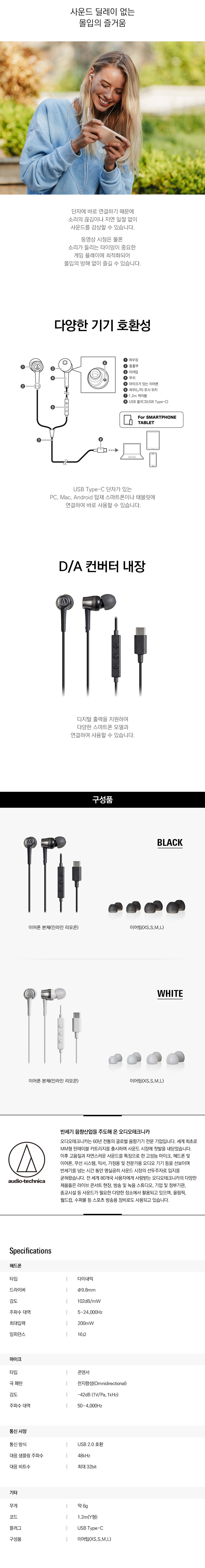 오디오테크니카 ATH-CKD3C Φ9.8mm 다이나믹 드라이버 C타입 고해상도 이어폰 화이트