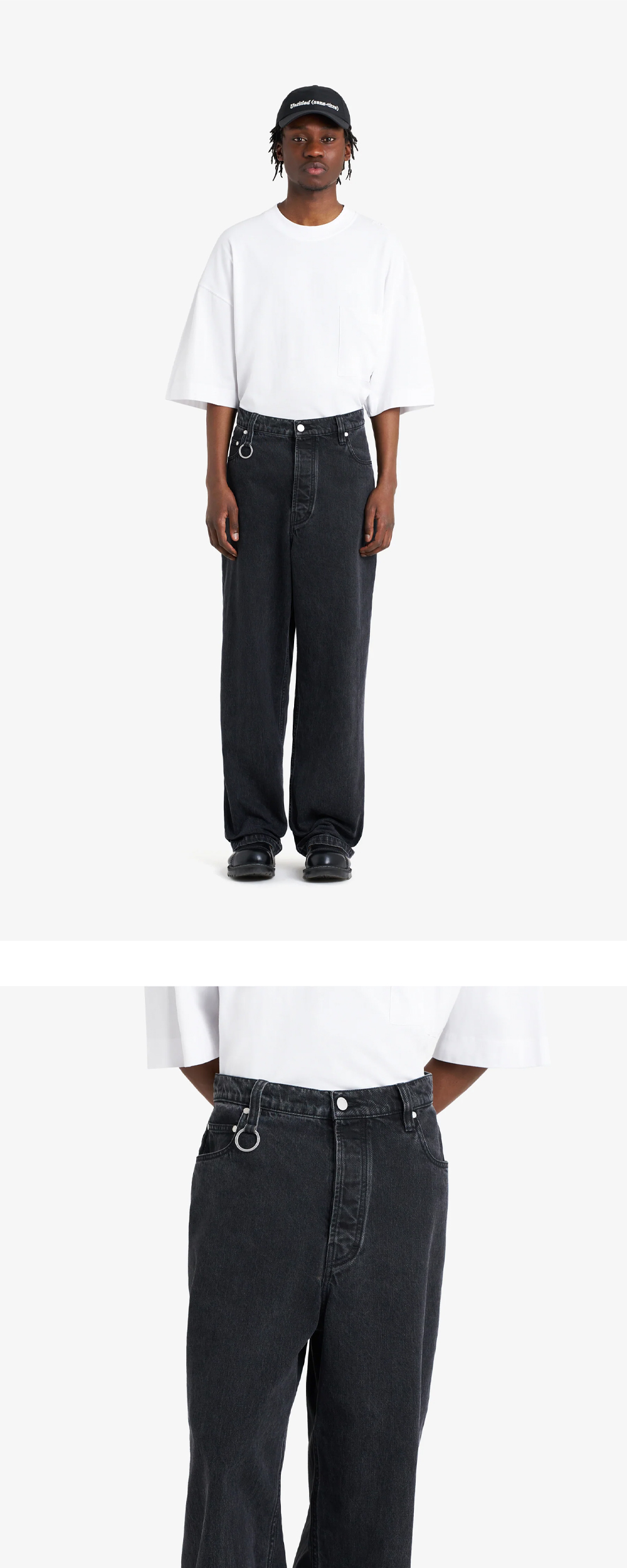 넉넉한 실루엣에 가죽 패치와 키링으로 포인트를 더한 에뛰드 스튜디오의 루즈 진 팬츠입니다. - 미디엄라이즈 스타일 - 여유 있는 배기 핏 - 버튼 플라이 - 에뛰드 스튜디오 로고가 새겨진 리벳 및 전면 키링 - 후면 로고 가죽 패치