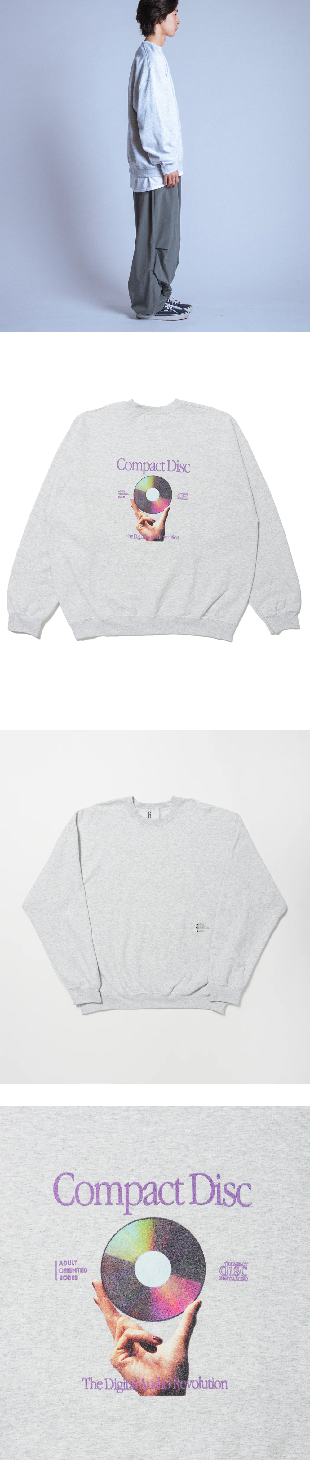 CD가 세상에 처음 등장한 시점의 광고에서 영감받은 AOR의 스웨트셔츠입니다. - 1950년대 재즈 문화와 당시의 재즈 슈퍼스타들에게 영감받은 24-25 시즌 컨셉 - 드롭 숄더 디자인 - 전면 좌측 로고 프린팅 - CD가 출시되었을 때, 소니와 필립스의 1982년 광고에 경의를 표하는 후면 그래픽 - 50/50 비율 원단 특유의 촉감