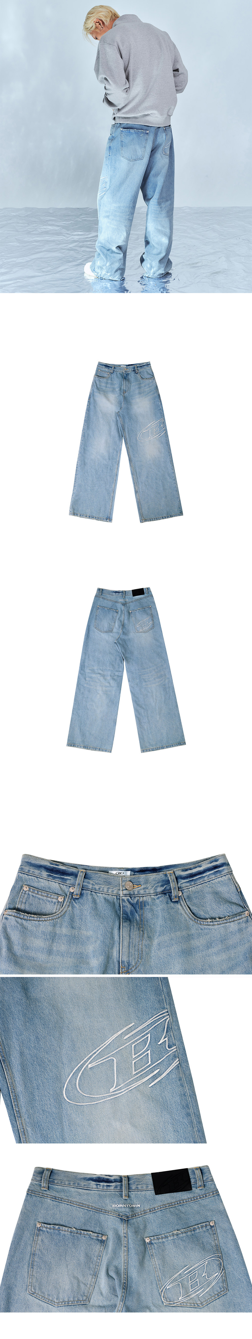 [DETAILS] * 스트로크 B 워시드 와이드 데님 팬츠 - 빈티지 스톤 워싱 - 스트로크 B 로고 자수 포인트 - BORNROWIN 레터링 자수 포인트 - 음각 로고 가죽탭 - 와이드핏 Material : COTTON 100% Fitting : TJ 2 Size, 172cm, 74kg / DS 2 Size, 178cm, 70kg / DJ 2 Size, 183cm, 88kg