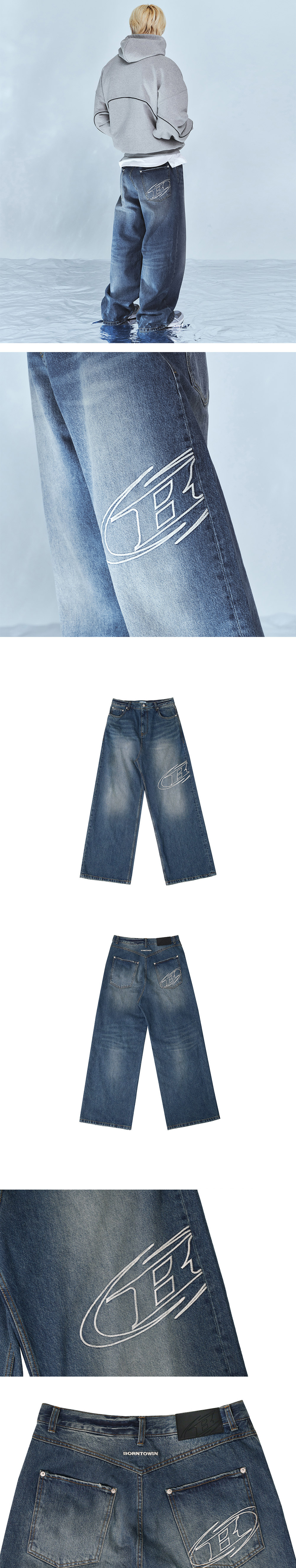 [DETAILS] * 스트로크 B 워시드 와이드 데님 팬츠 - 빈티지 스톤 워싱 - 스트로크 B 로고 자수 포인트 - BORNROWIN 레터링 자수 포인트 - 음각 로고 가죽탭 - 와이드핏 Material : COTTON 100% Fitting : TJ 2 Size, 172cm, 74kg / DS 2 Size, 178cm, 70kg / DJ 2 Size, 183cm, 88kg