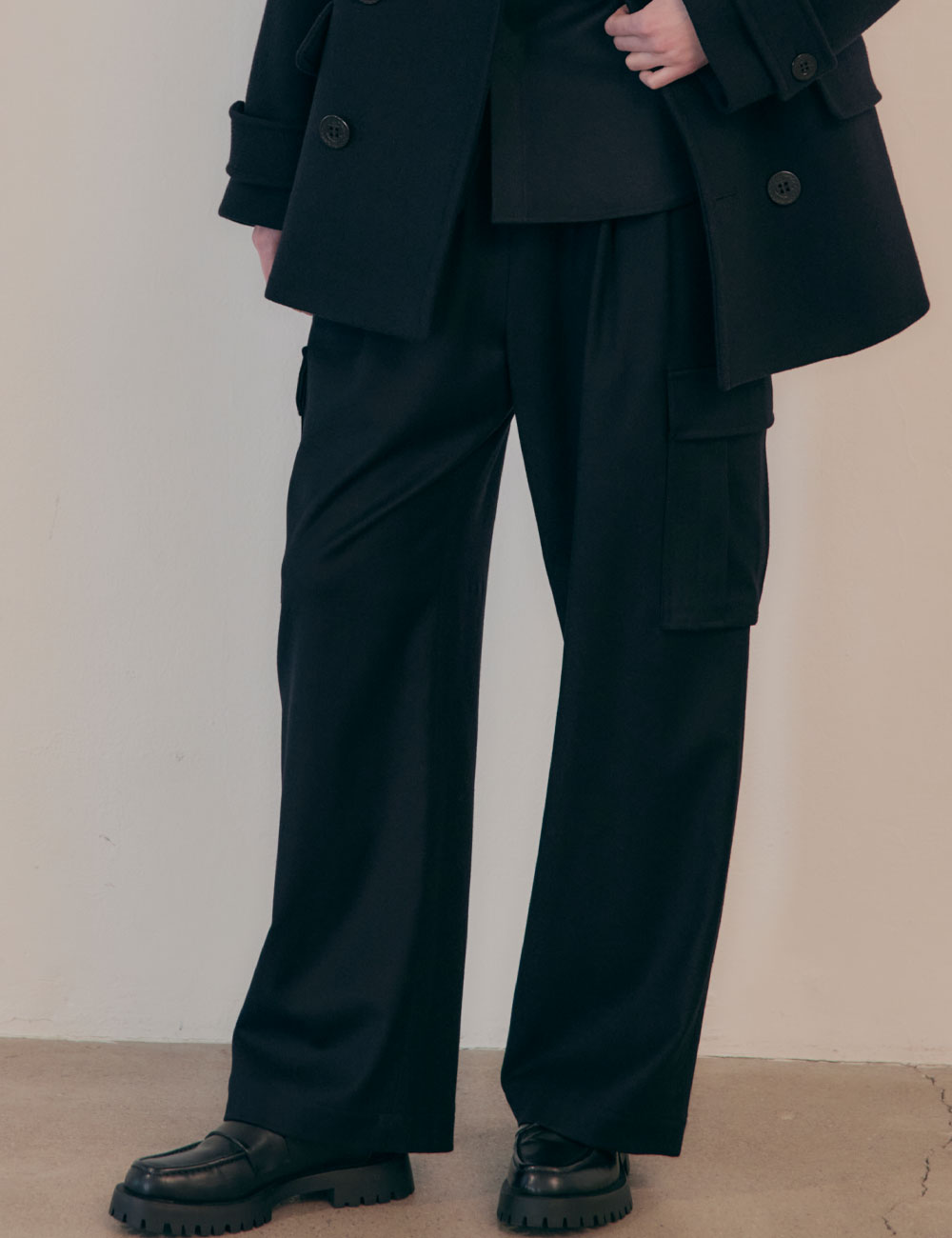 - 와이드 핏의 울 카고팬츠 - 따뜻하면서도 가벼운 원단 사용으로 편안한 착용감 - 허리 이밴드 사용 - 사이드 아웃포켓 - 243-2001 WOOL SHIRT와 셋업 스타일링 가능