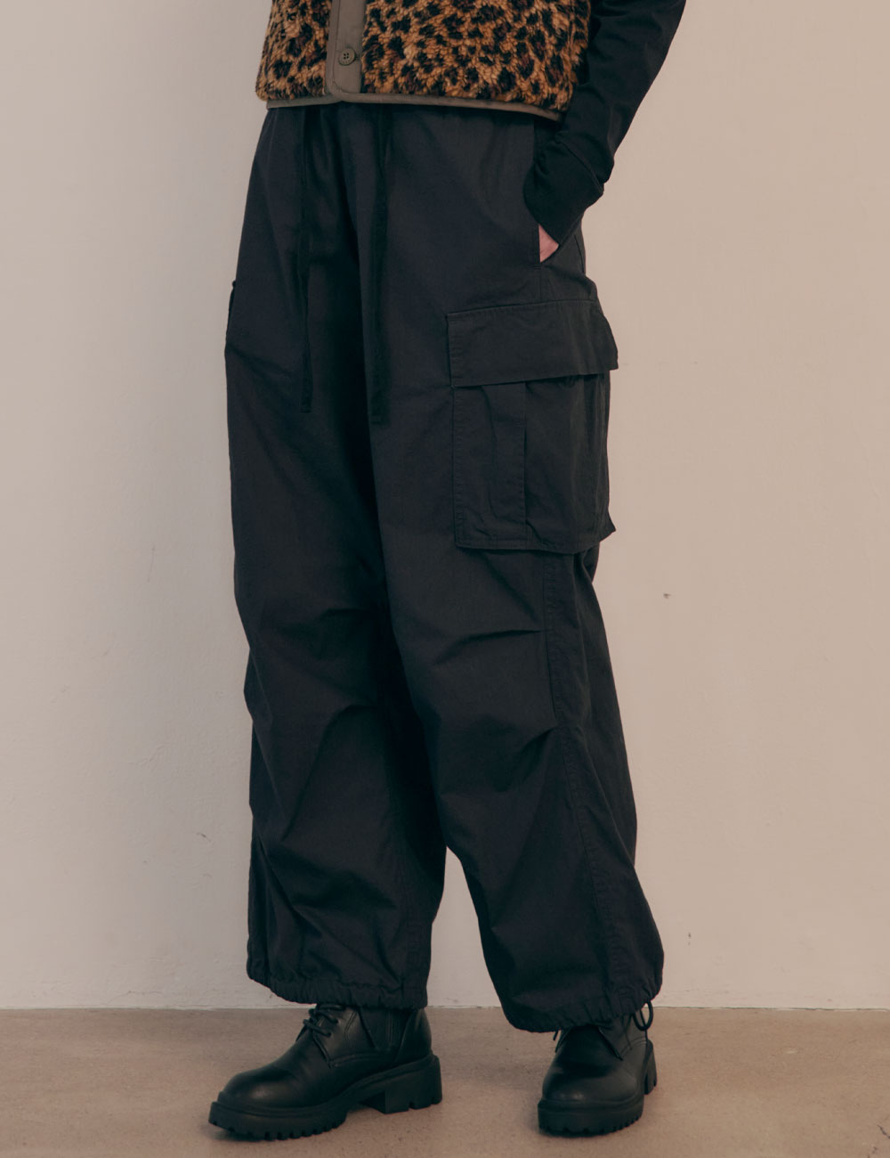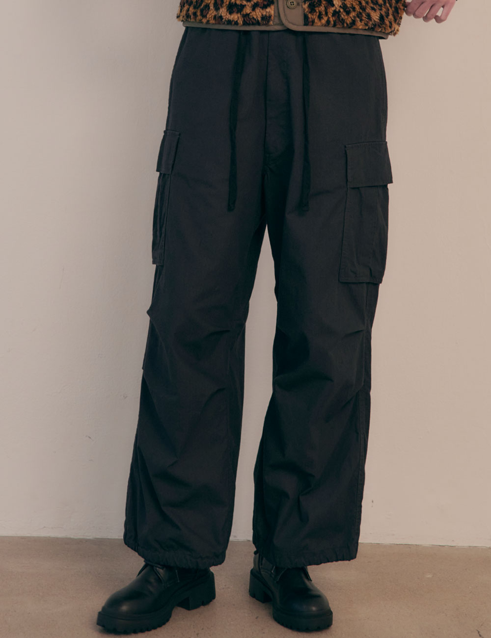 - 루즈 핏의 카고 팬츠 - 해외 수입 원단으로 제작하여 편안한 착용감 - 허리밴딩과 밑단 스트링으로 자유로운 사이즈 - 무릎 턱 디테일 - 밑단 스트링 내장 - 이지케어 원단