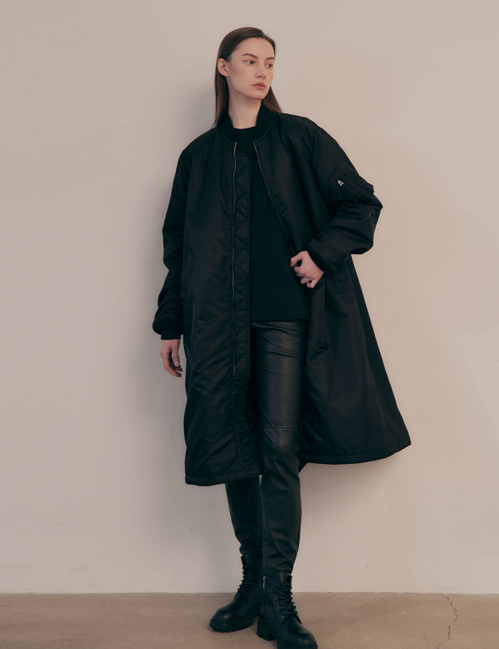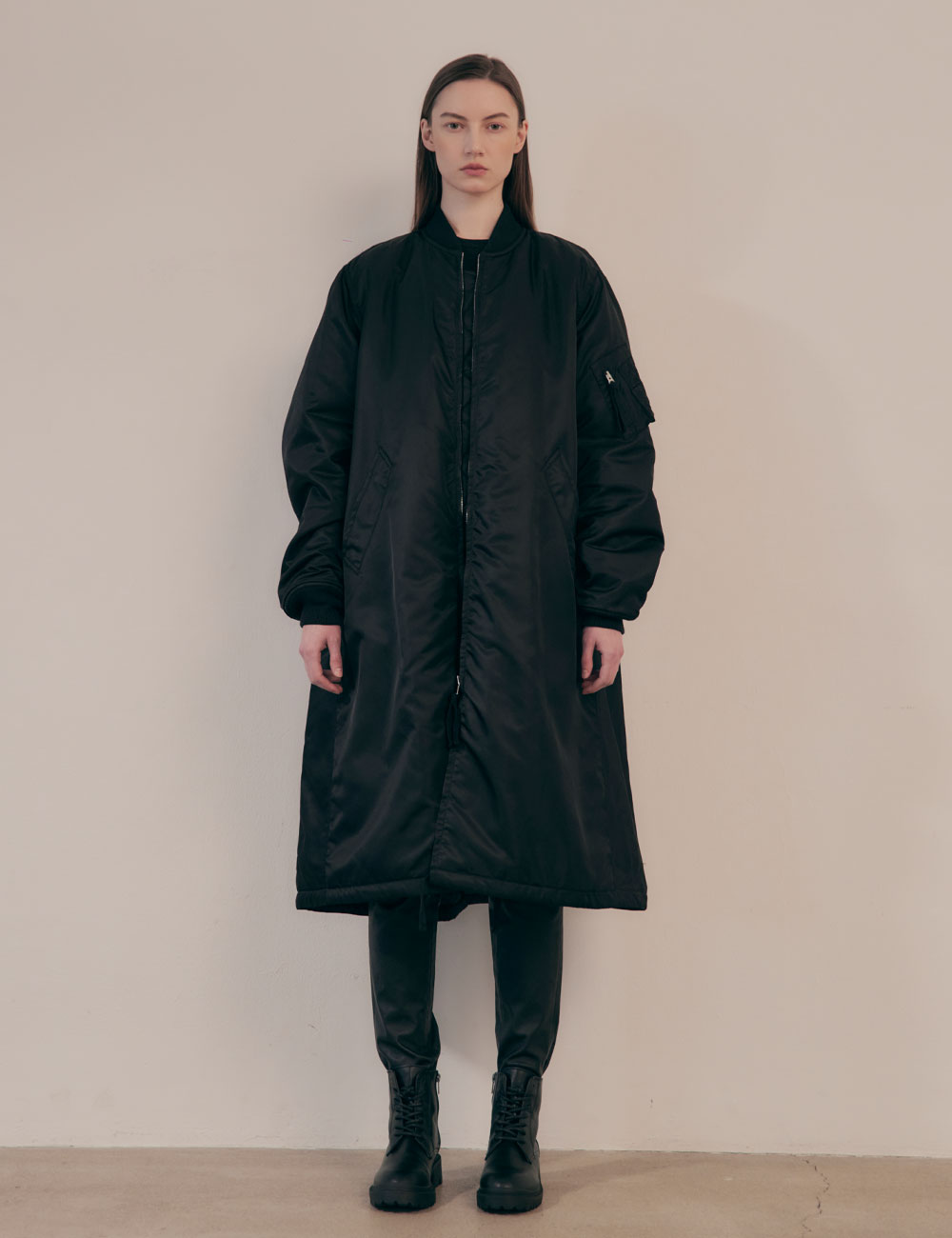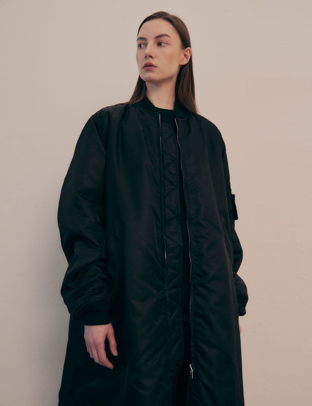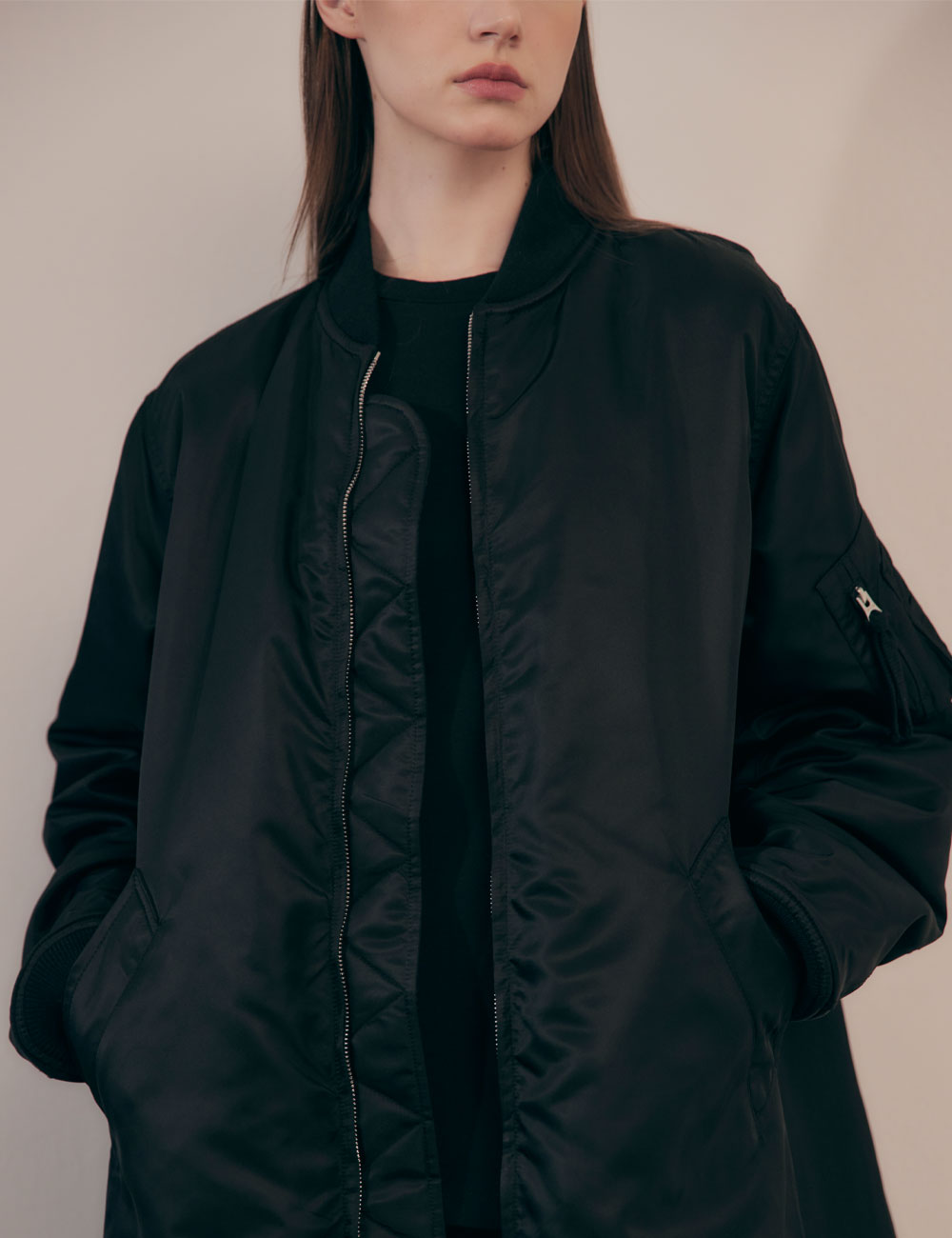 - 밀리터리 자켓에서 영감을 받은 VIS A VIS 시그니처 MA-1 코트 - 3온스 충전재를 사용하여 간절기와 초겨울까지 레이어드로 다양한 스타일링 가능 - 보온성을 위한 퀼팅 안감, 립 시보리 - 소매 턱, 포켓 디테일 - 밑단에 폭 조절 가능한 스트링 부착 - 몸판 내부에 포켓