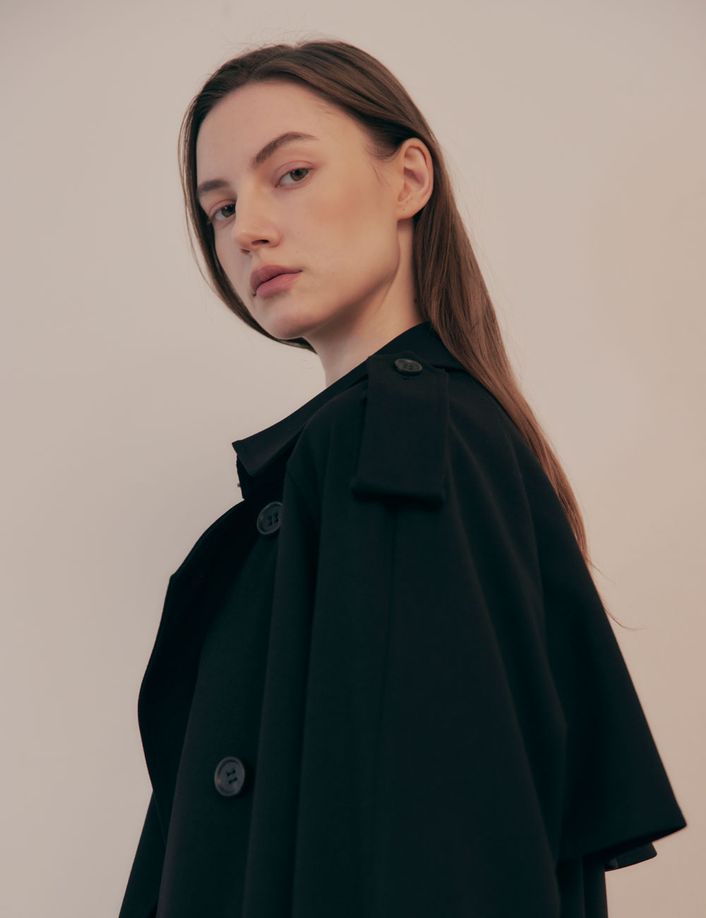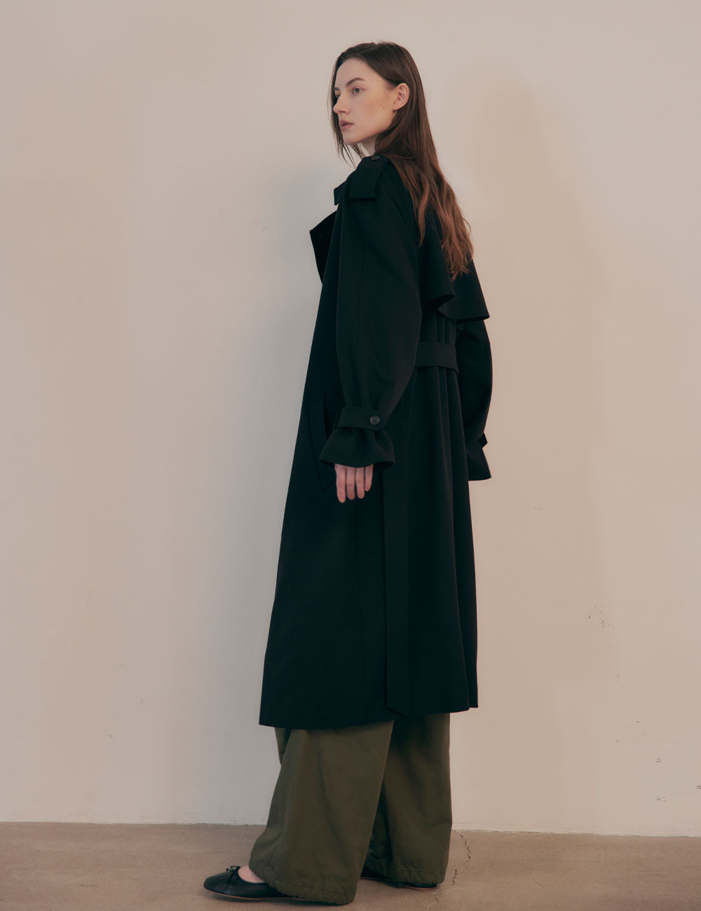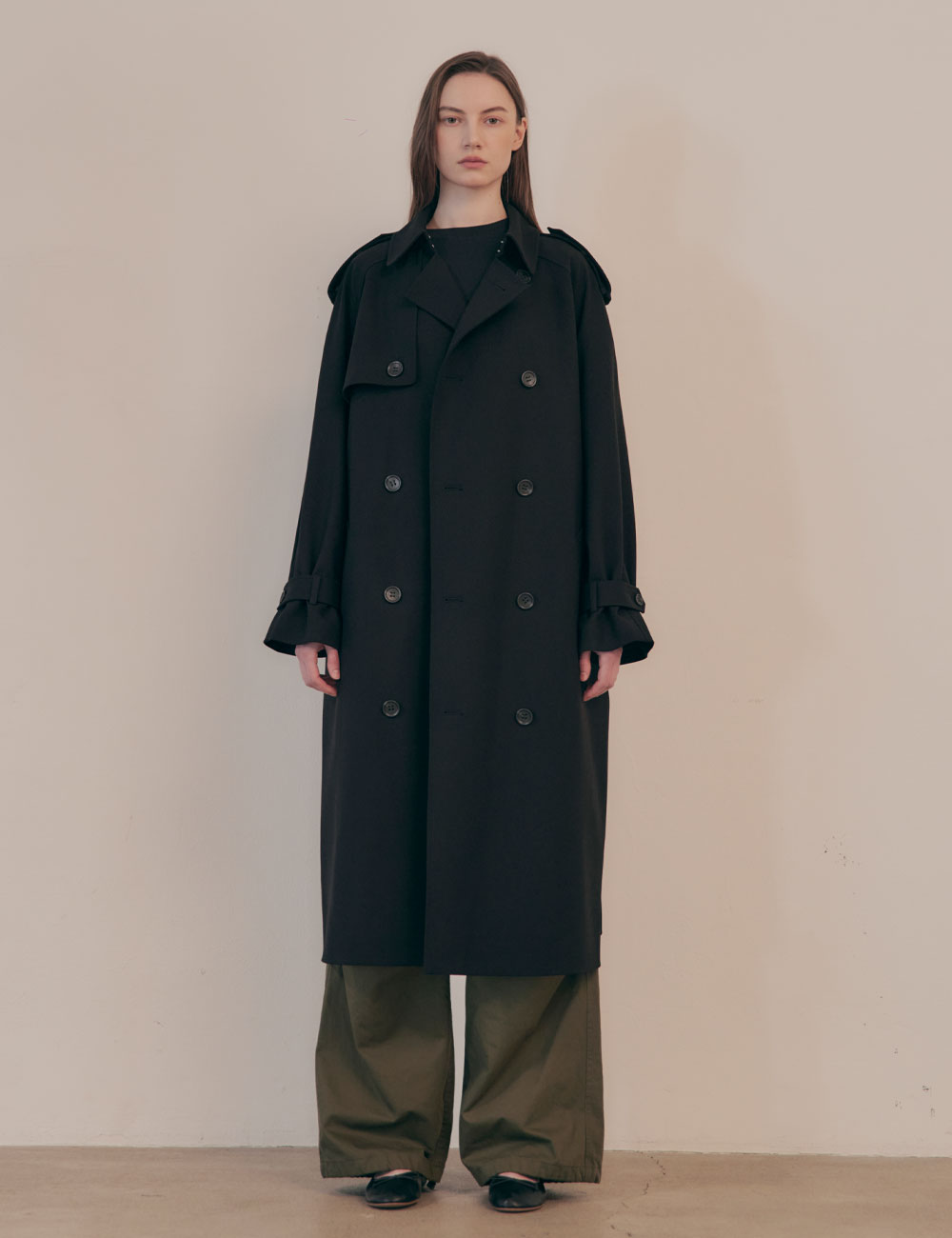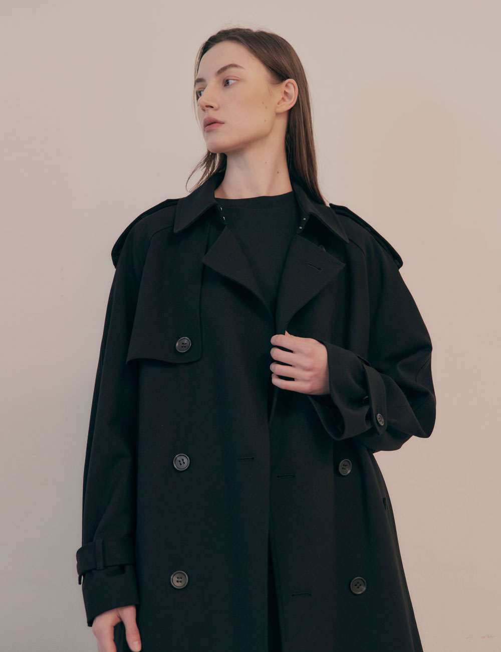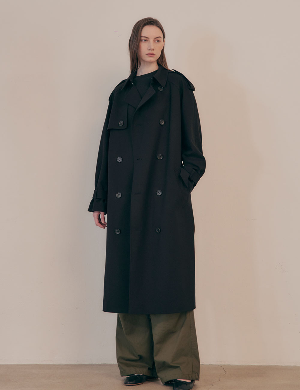 - 루즈한 핏의 더블 브레스티드 여밈 트렌치 코트 - 앞, 뒷면에 스톰 플랩 - 전면 안감과 두개의 안 주머니 - 래글런 소매와 견장 디테일 - 조절 가능한 소매 버튼 탭과 탈착식 벨트