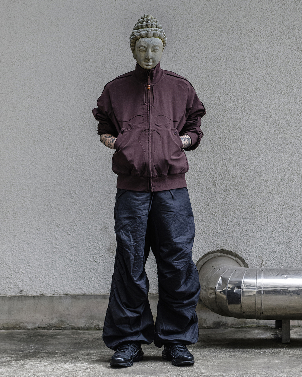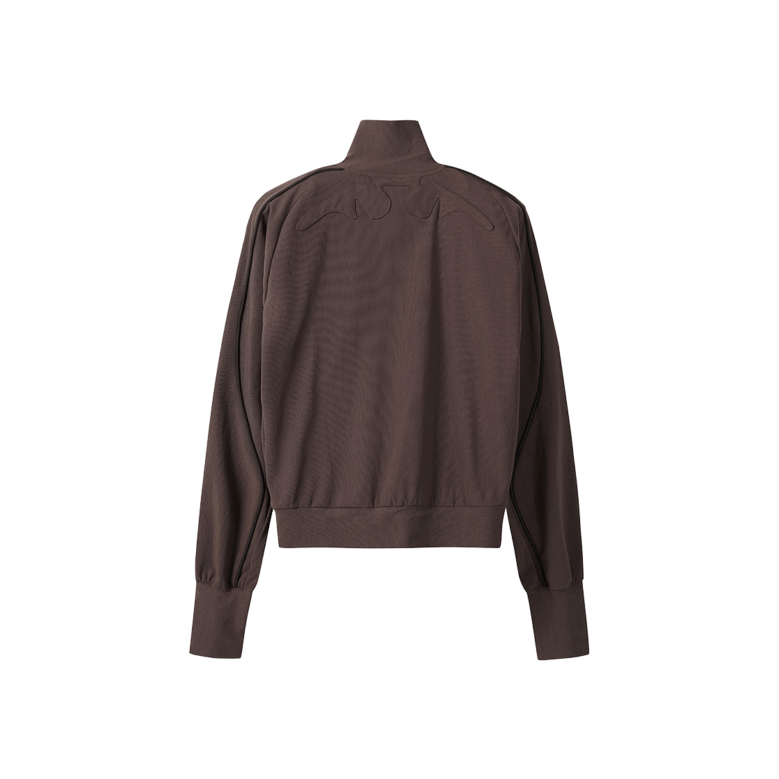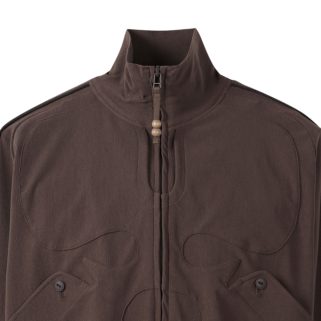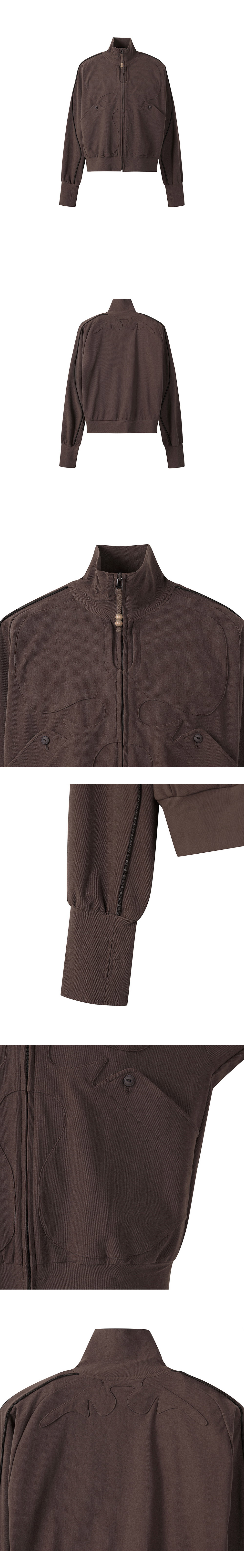 중국의 전통 예술, '변검(変面師)'을 모티브로 한 디자인, 지안 예의 HNMN 탑입니다. - 전/후면 변검극 가면에서 영감 받은 패치 디자인 - 약간 타이트하나, 우수한 신축성으로 높은 활동성 - 시그니처인 우드 소재의 구슬 지퍼 패스너 - 입체적인 소매 패턴 및 소매 썸홀 디테일 - 약간 크롭한 기장