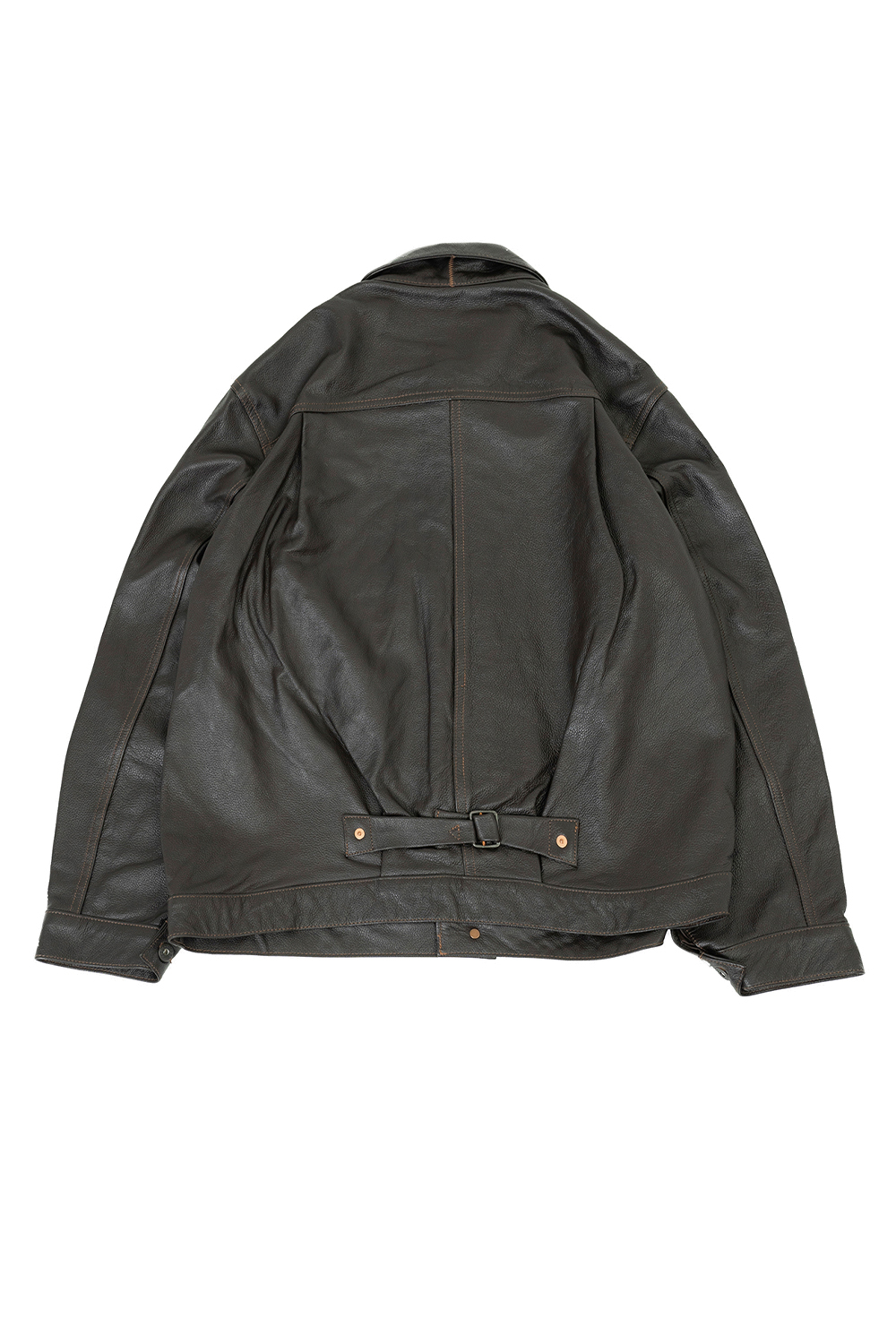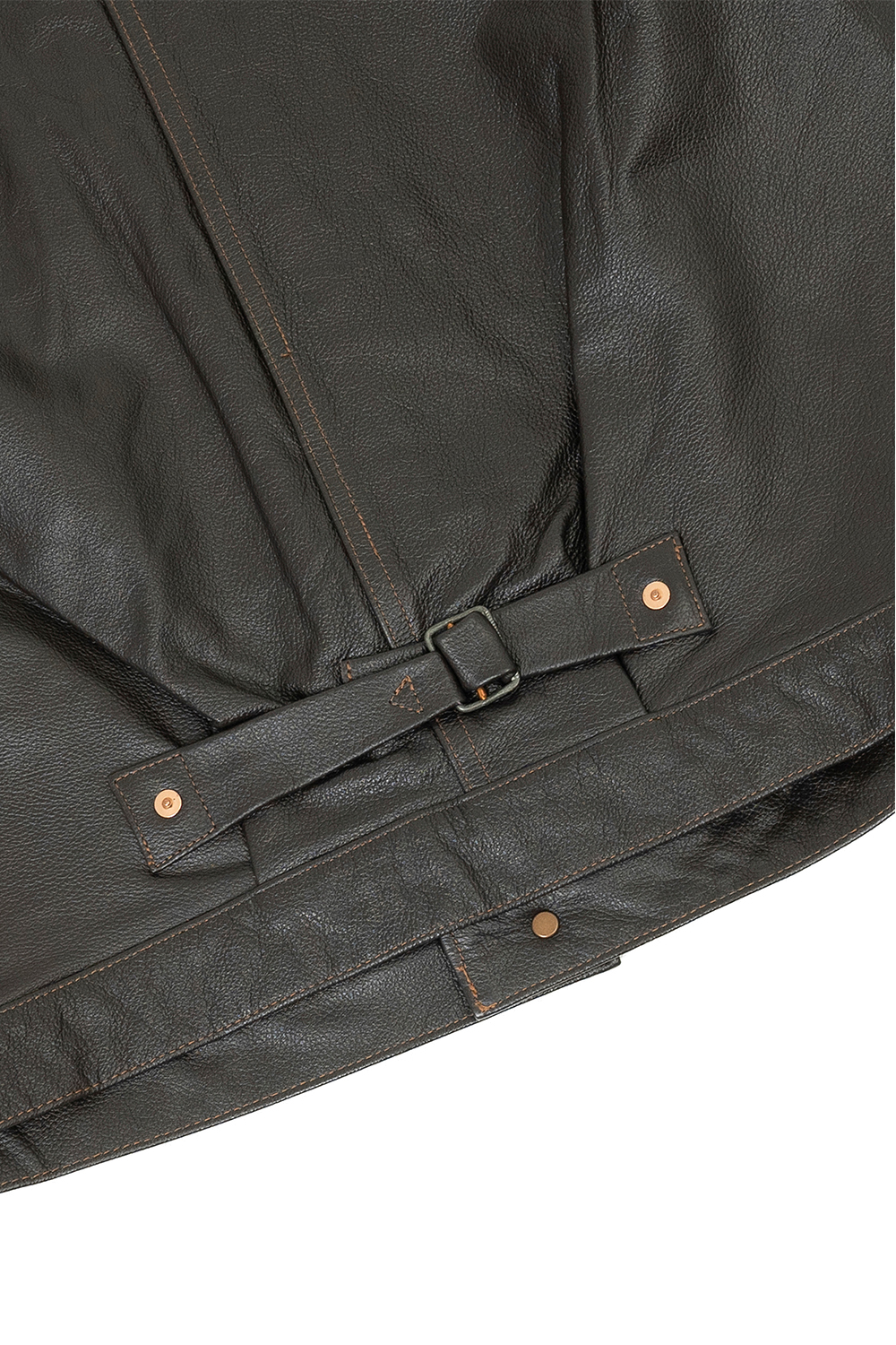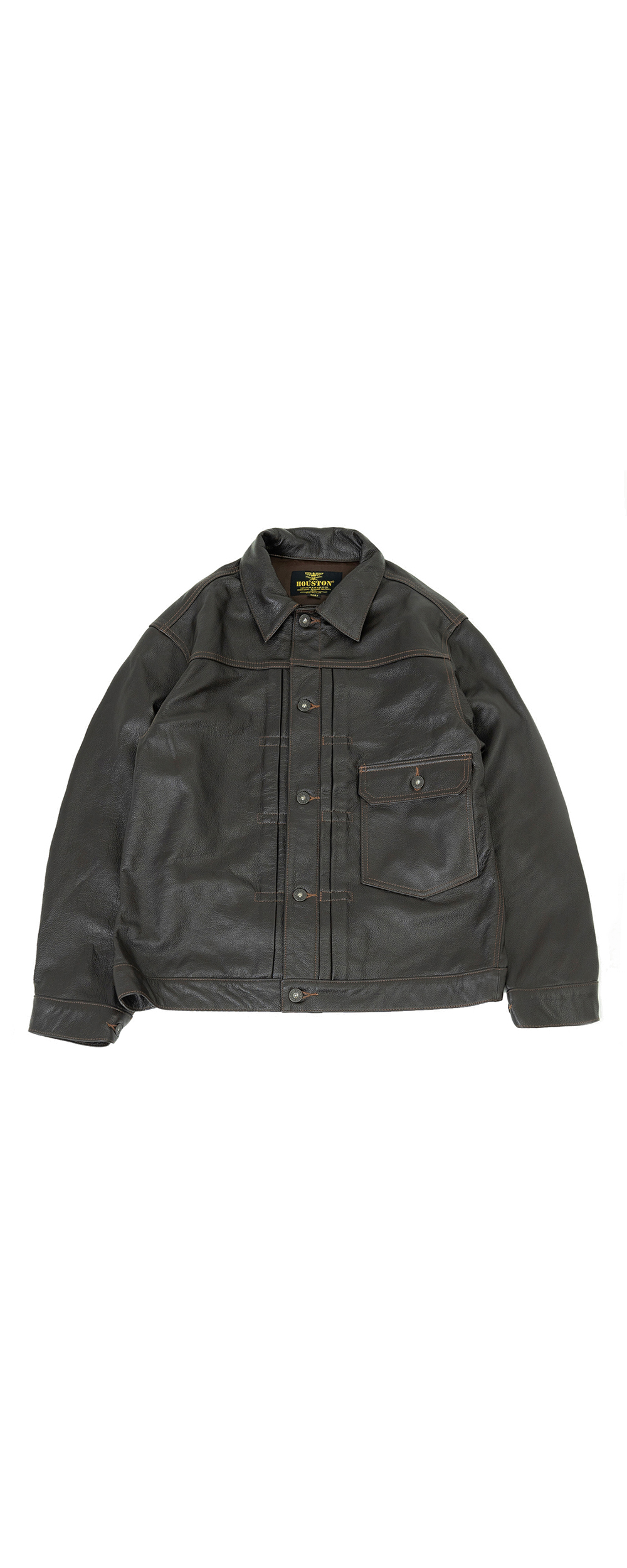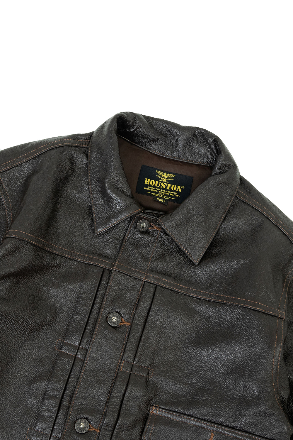 Houston Japan 8215 Cow Leather Track Jacket - Brown 두께감이 있는 소가죽을 사용한 1세대 타입의 트러커 자켓입니다. 월계수버튼/ 뒷판의 T-BACK/ 신치백 등 빈티지 특유의 고증을 남김없이 도입했습니다. 안감은 광택 있는 큐프라를 사용했으며. 블랙, 브라운 2컬러로 제작했으며 브라운 컬러에는 밀리터리 아이템 느낌을 내기 위해 카키색의 스티치로 배색 효과를 줬습니다. * Upper : Cow Leather 100% * Lining : Polyester 55% / Cupra 45% * 빛에 의한 제품의 색감 차이가 존재 할 수 있습니다. * Made in China