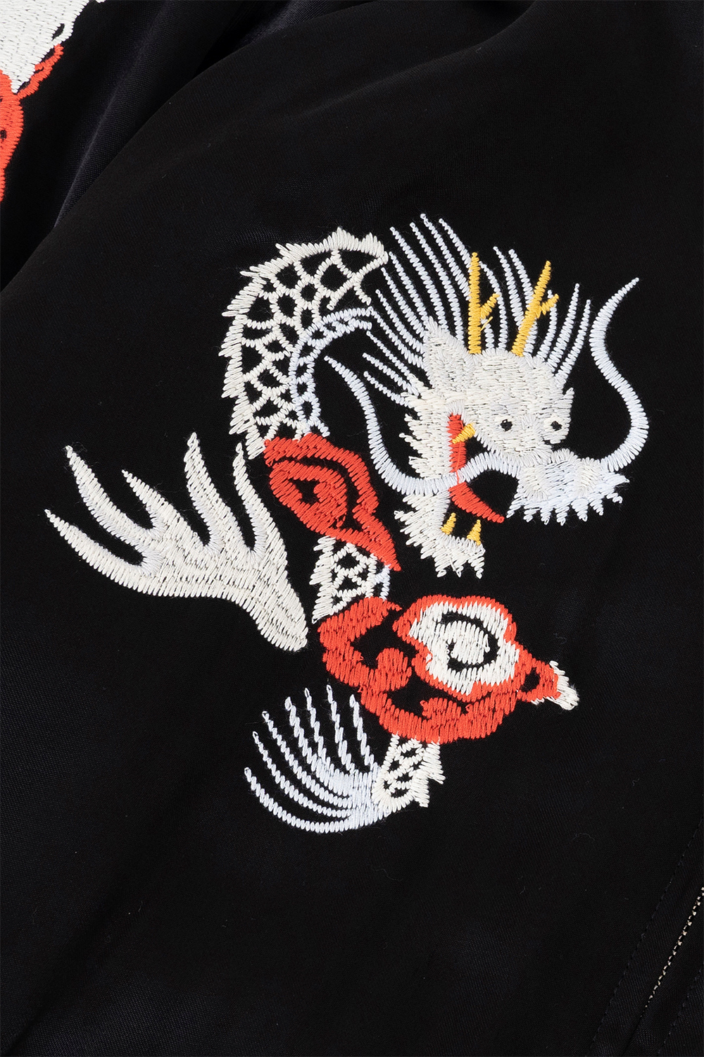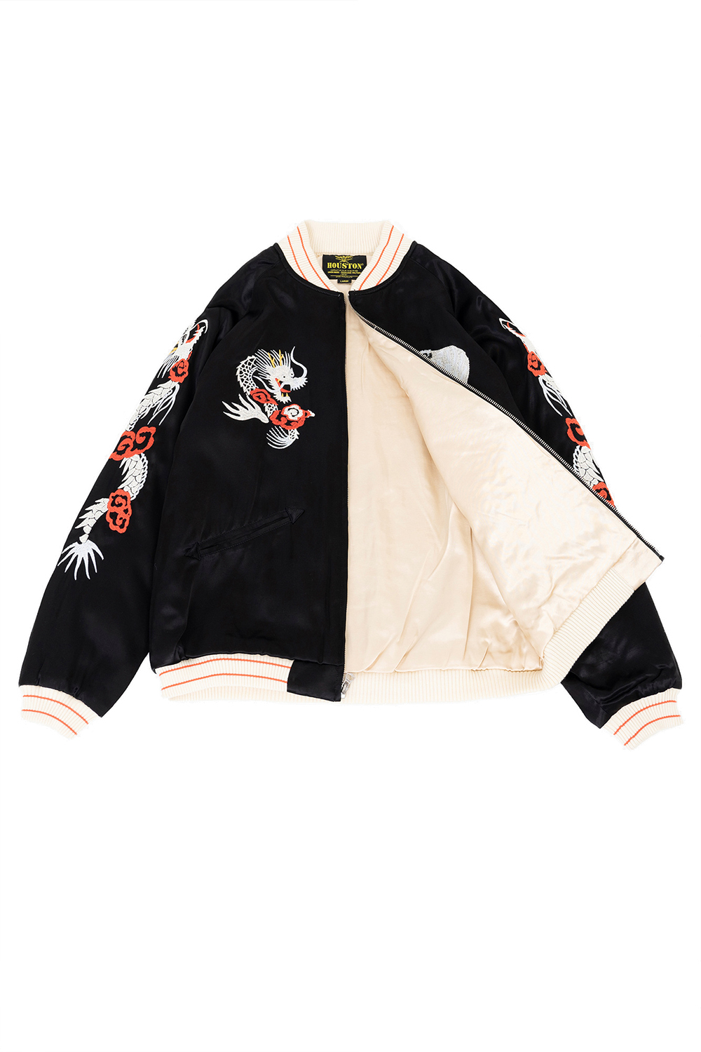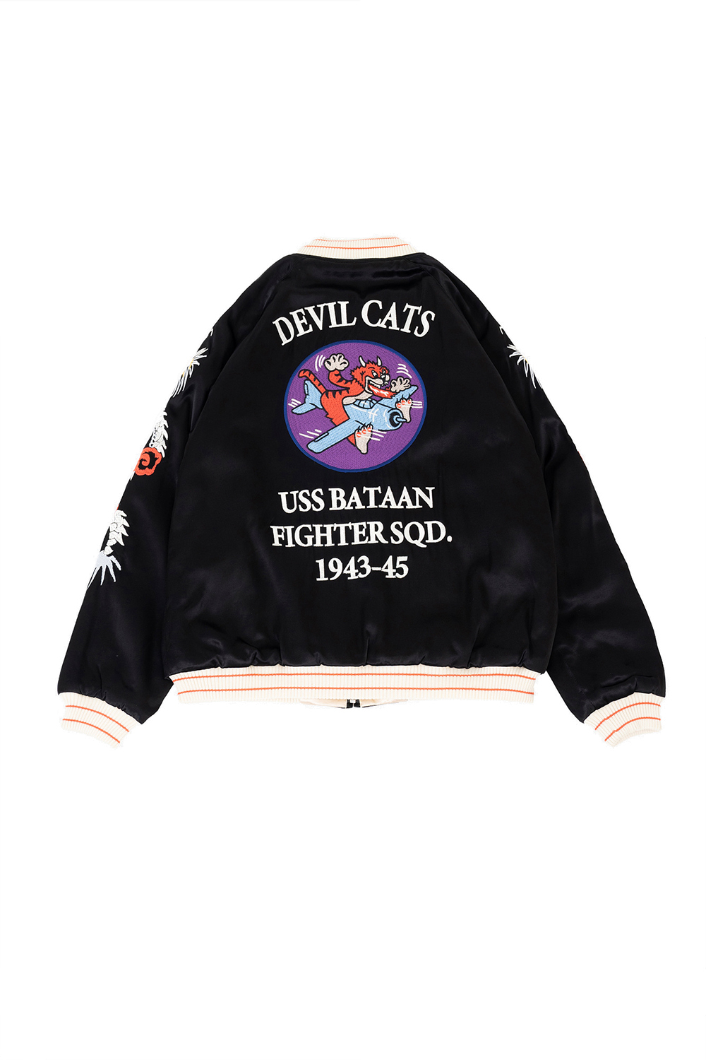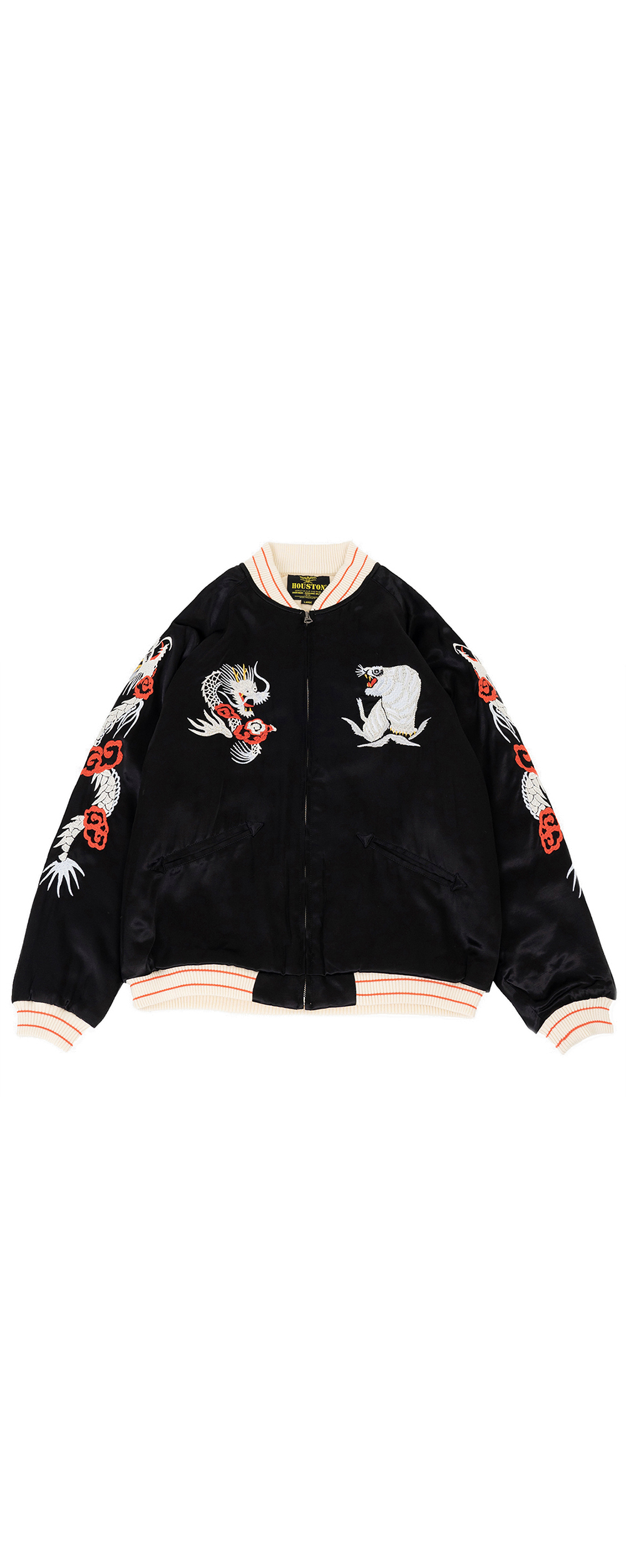 Houston Japan 51400 Souvenir Jacket (Davil Cats) - Black 촉감이 좋고 탄력이 좋은 두툼한 레이온 새틴 원단을 사용한 수베니어 재킷입니다. 양쪽 가슴과 소매에는 빈티지한 느낌의 용과 호랑이 자수가 놓여져 있습니다. 등판에는 미해군 VF-50 전투 비행대 "데빌캣츠"를 샘플링한 요철감있는 자수가 있습니다. 수작업한 느낌의 자수로 완성한 클래식한 외관이며 요염하고 화려한 광택감이 매력적인 수베니아 재킷으로 완성되었습니다. 안감은 겉감과 같은 원단을 사용했고 안감 솜이 들어가 보온성도 뛰어난 자켓입니다. * Upper : Rayon 100% * Lining : Polyester 100% * Lib : Acrylic 100% * 빛에 의한 제품의 색감 차이가 존재 할 수 있습니다. * Made in China
