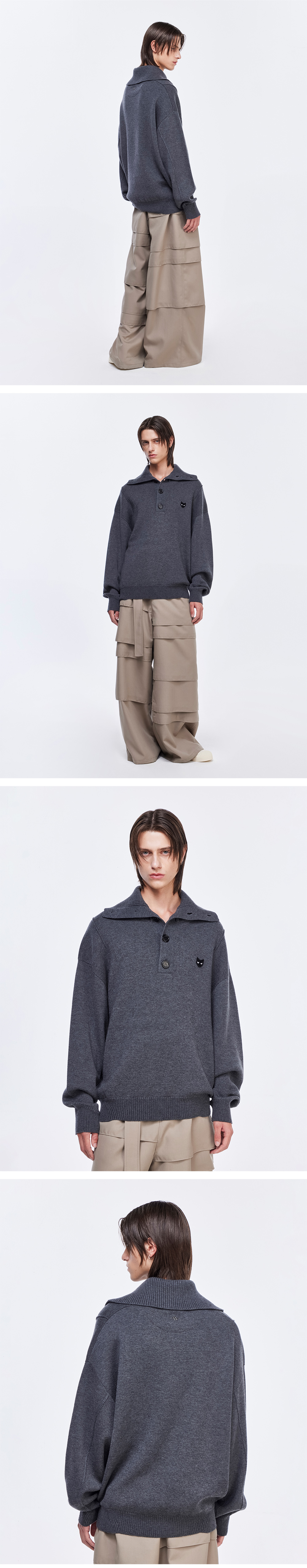 - 밀라노 조직의 니팅 로프 버튼 하이넥 니트 - 은은한 광택의 울 혼방 원사 사용 - 옆선과 소매 니팅 로프 디테일 - 후면 지제로 로고 금속 장식 디테일 - 전면 가슴 '그레이 아이즈' 펜서 와펜 - 후면 하단 지제로 로고 조직 포인트 - 소매단, 밑단 변형 립 조직 - MADE IN VIETNAM