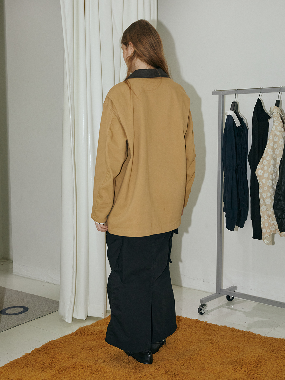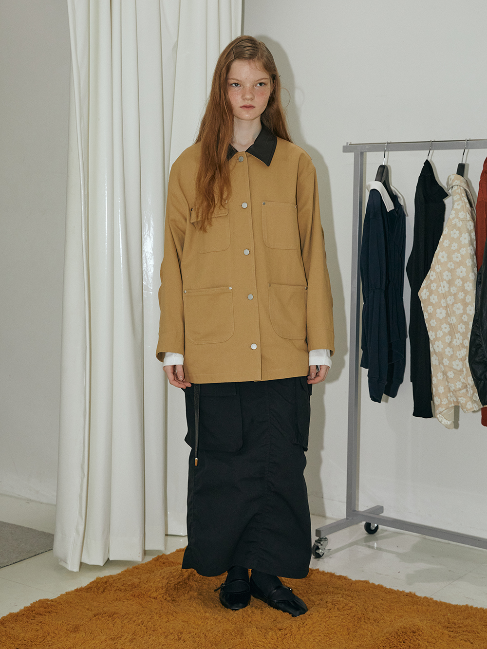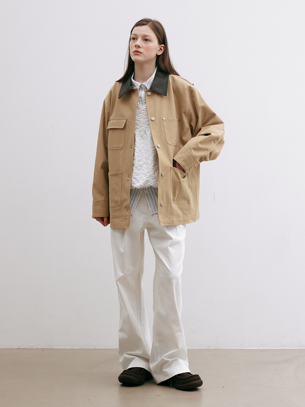 2024 FW COLLECTION - 바이오 워싱을 통한 부드러운 촉감의 워크자켓 - 카라부분의 에코레더 배색 디테일 - 소매의 셔링 포인트 - 전면,소매의 YKK사의 리벳,켄톤 부자재 - 후면의 등판 여유분 디테일 - Made in korea +COLOR BEIGE +CARE Dry cleaning