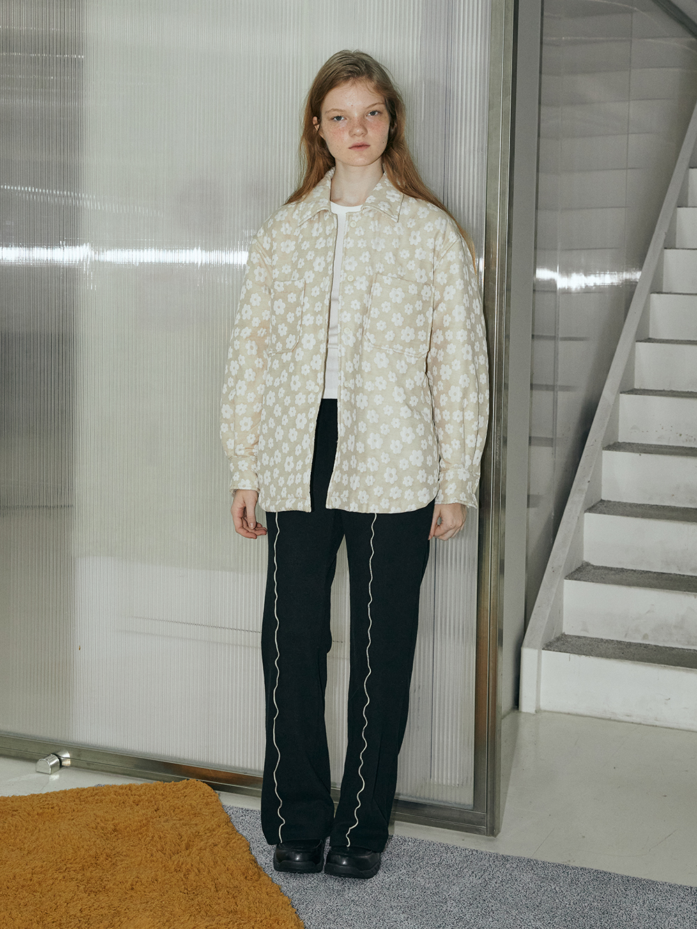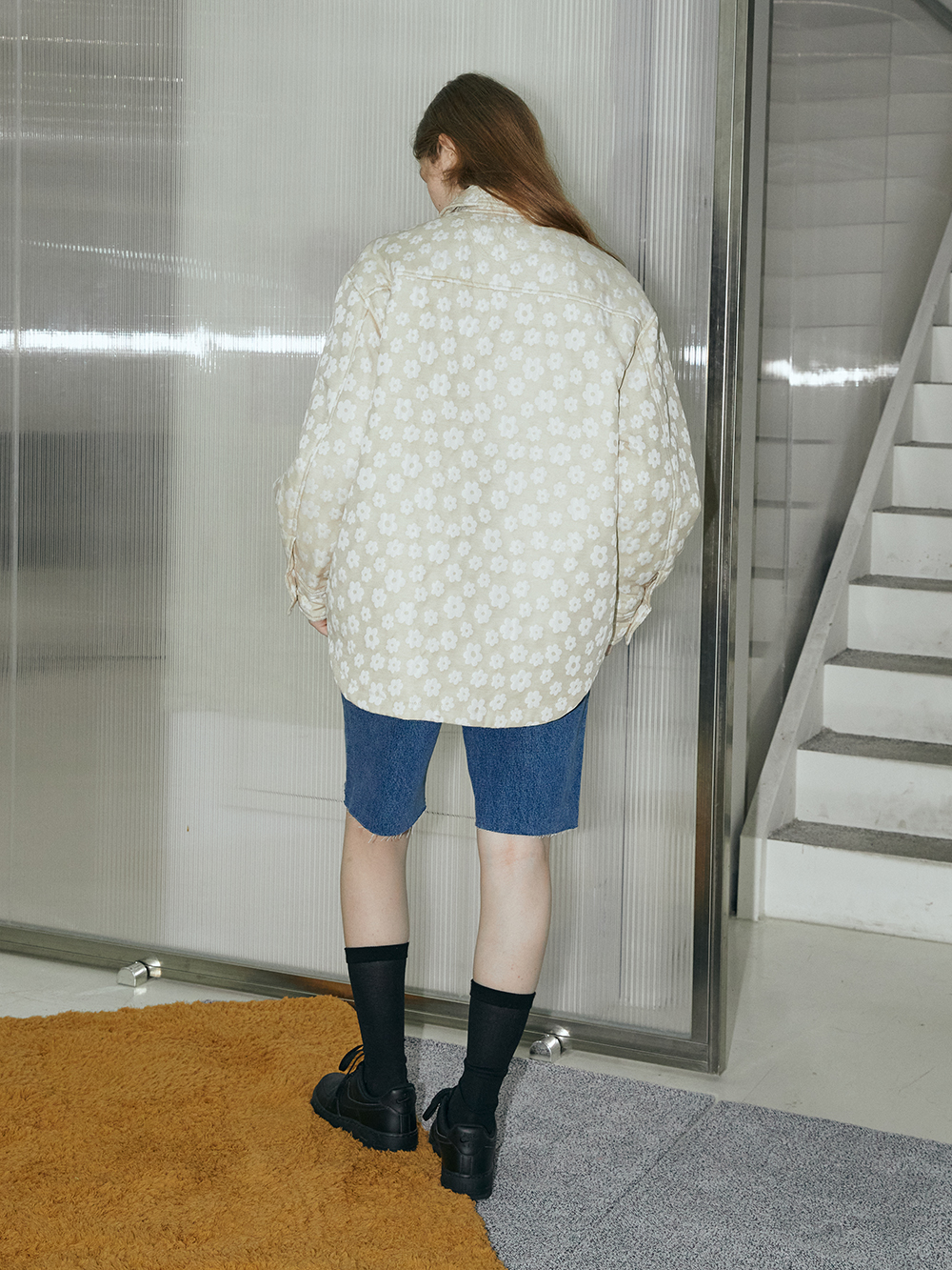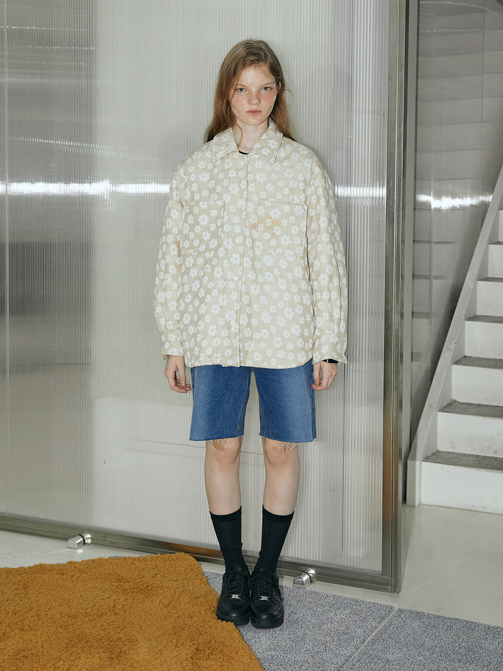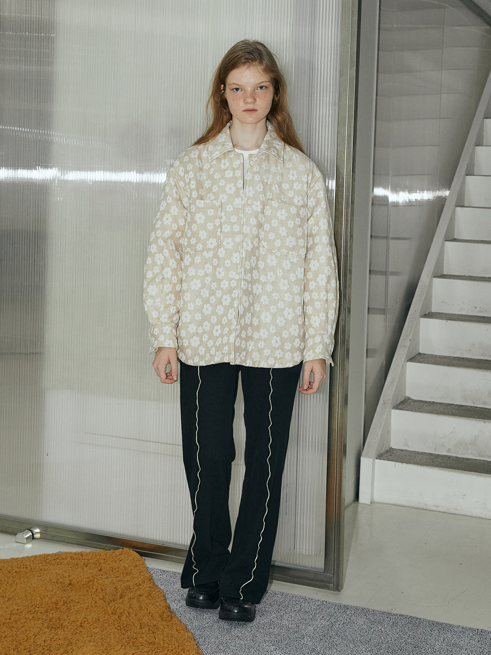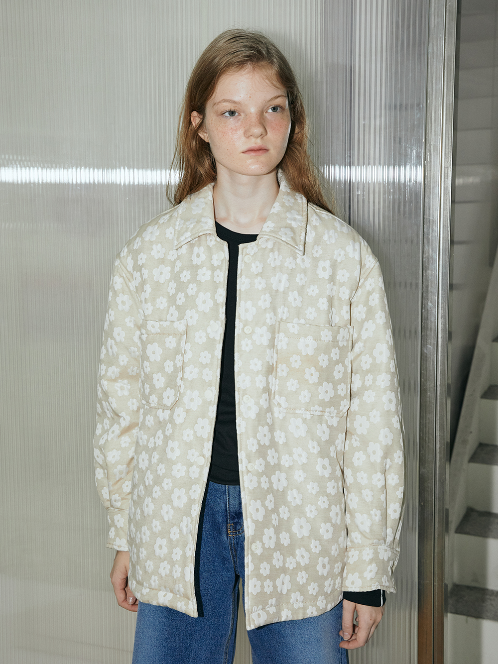 2024 FW COLLECTION - 플라워 자카드의 COTTON,POLY 혼방의 원단 - 3온스의 솜 충전재를 통한 보온성 - 전면, 소매부분의 스냅 디테일 - 가벼운 무게의 루즈한 실루엣의 셔츠자켓 - Made in korea +COLOR BEIGE +CARE Dry cleaning