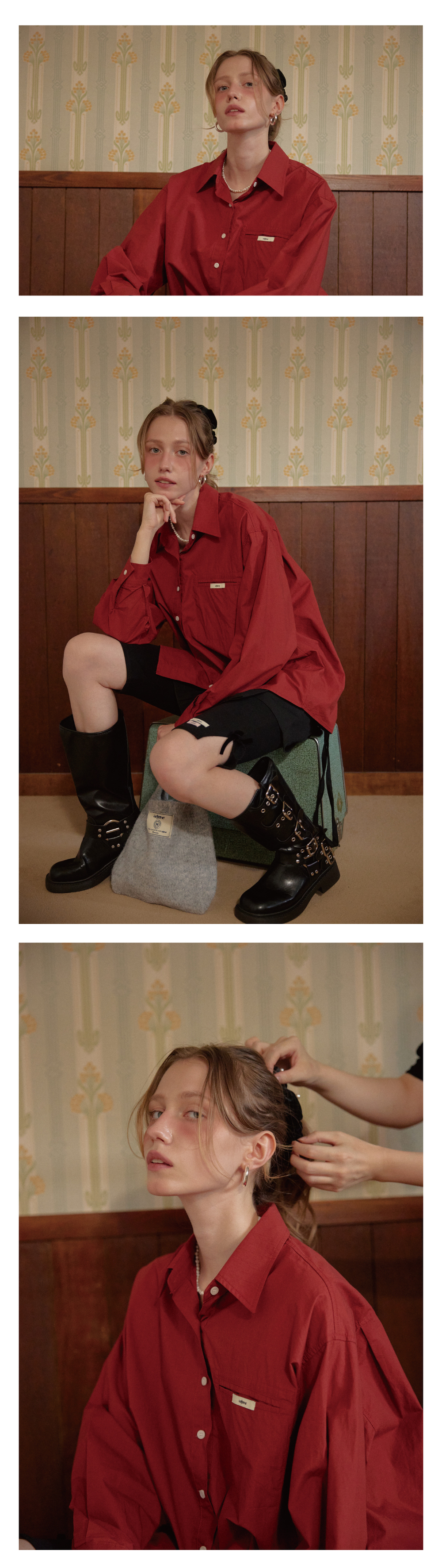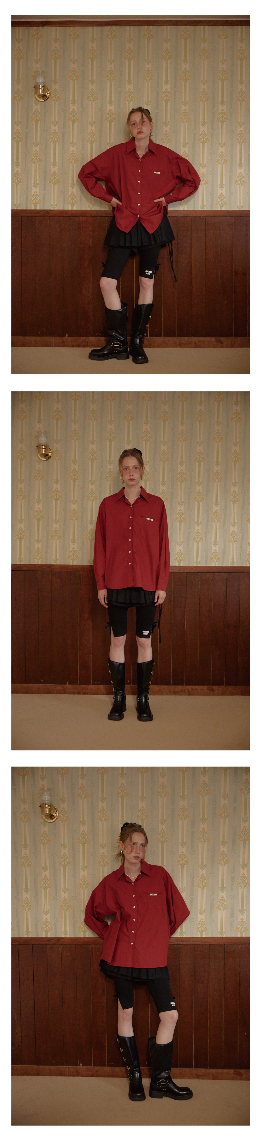 레터리 라벨 오버핏 셔츠 버건디