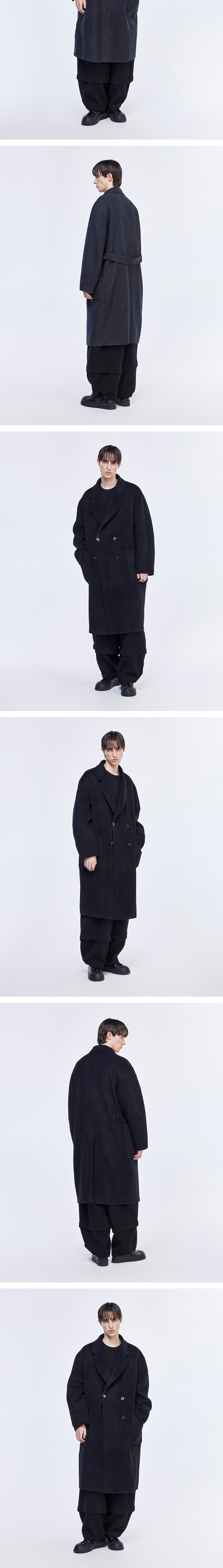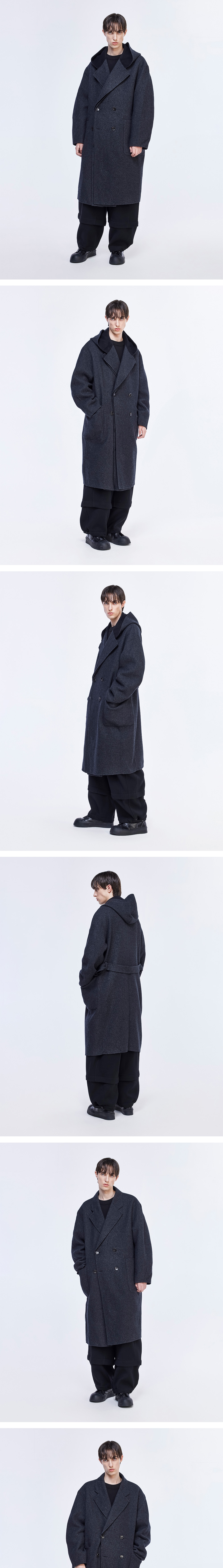 - 오버사이즈 코쿤 실루엣의 핸드메이드 후드 디테처블 코트 - 넓은 형태의 노치드 라펠 구성 - 후드 디테처블로 탈착 가능한 디자인 구성 - 리버시블 형태로 양면으로 착용 가능 - 제원단 벨트를 통한 여러가지 실루엣 연출 가능 - 소매 및 밑단에 위치한 다트를 통한 실루엣 변화 - 센터벤트 디테일 구성 - MADE IN CHINA