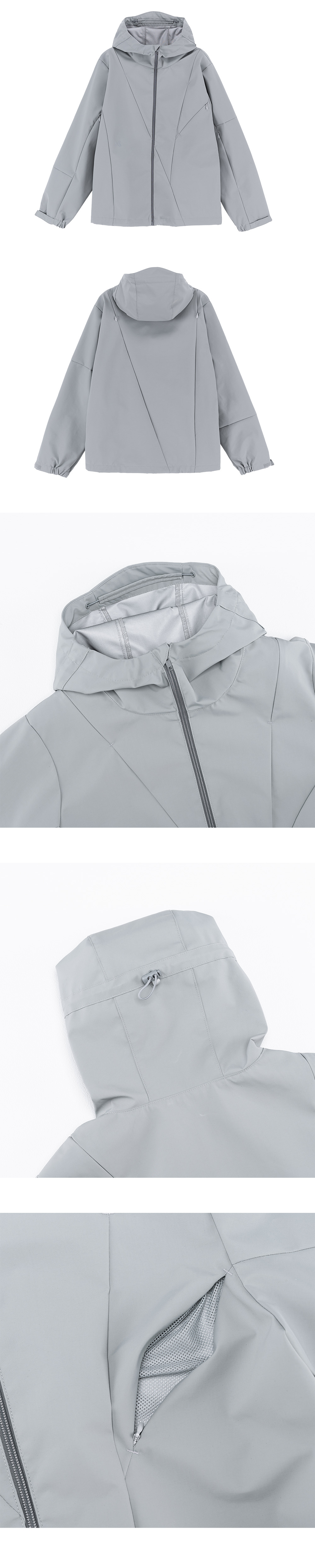 YKK 혼솔 및 오픈 지퍼를 사용하였으며 거미줄을 연상시키는 비대칭 절개 디테일이 특징입니다. 3 레이어 나일론 원단으로 뛰어난 투습성과 발수성을 제공하며 하이넥 스타일과 후드 챙을 더해 감각적인 아웃도어 무드를 연출합니다.