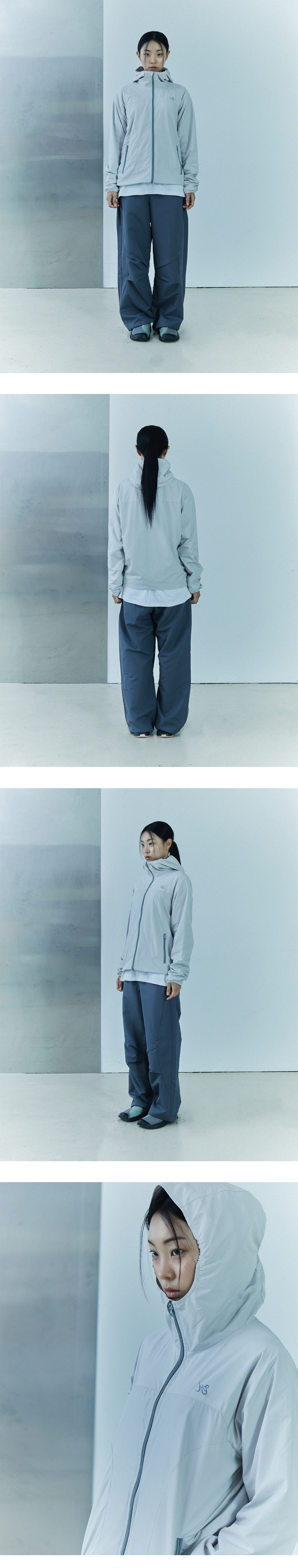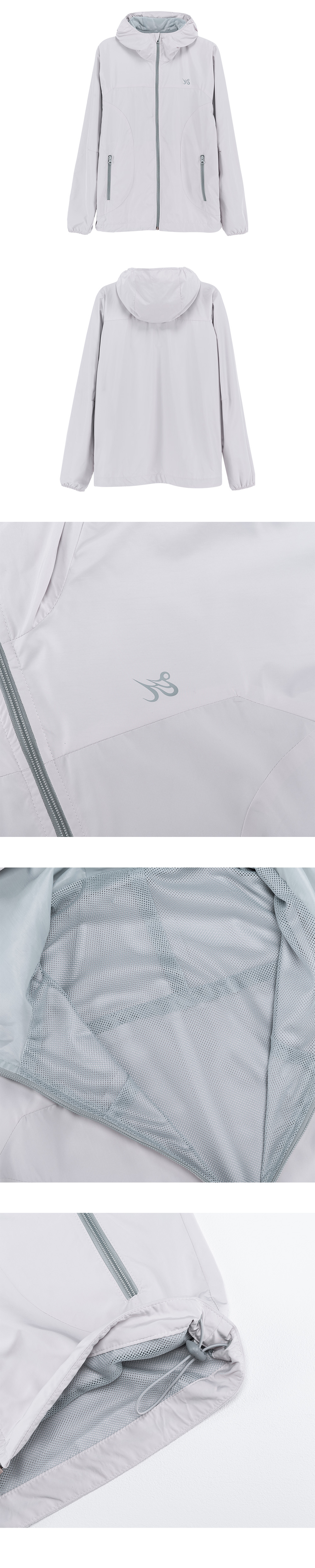 전면에 필름 전사 포인트와 YKK 오픈 지퍼를 사용하였습니다. 메쉬 안감을 사용하여 통기성을 강화했으며 래글런 스타일로 스포티하면서도 웨어러블한 착용감을 제공합니다. 밑단에는 스트링과 스토퍼가 있어 실루엣 조절이 가능합니다.
