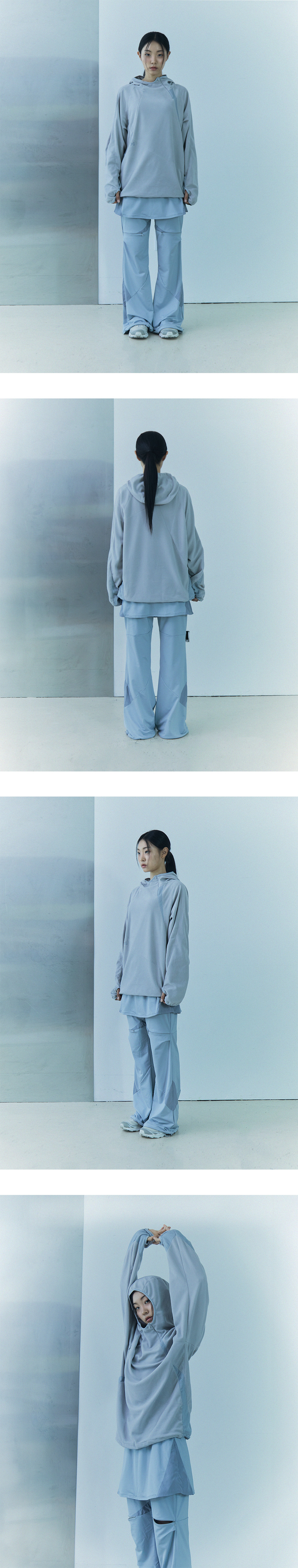루즈핏 래글런 디자인에 메쉬 배색과 비대칭 절개 디테일이 돋보이며 소매와 후드는 10mm 접밴드로 마감되었으며 핑거홀 디자인으로 편안함을 제공합니다.