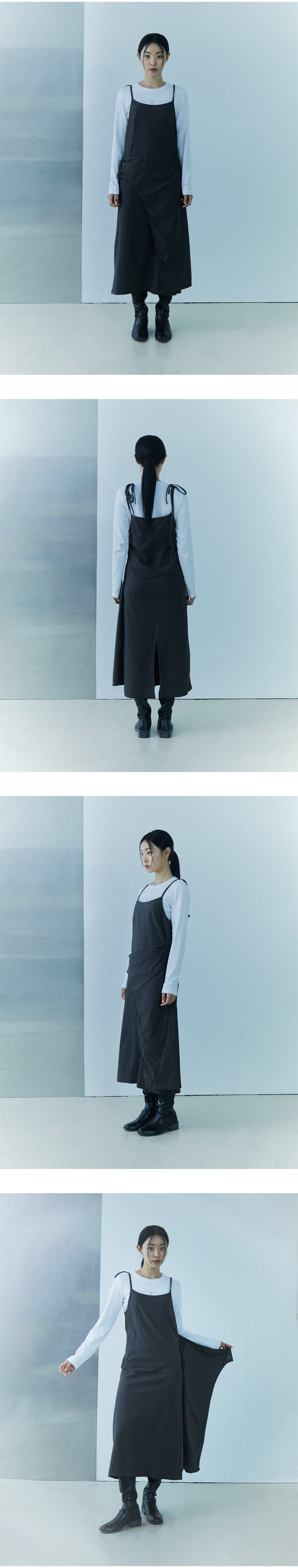코튼 100% 20수의 탄탄한 조직감과 허리끈으로 사이즈 조절이 가능합니다. 레이어드 패널과 스냅 단추로 다양한 연출이 가능하며 어깨 끈을 내려 스커트로도 스타일링할 수 있습니다.