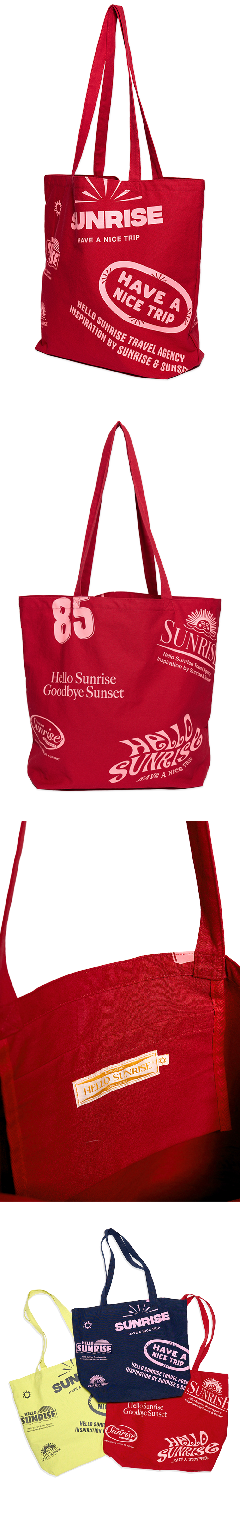 헬로선라이즈 그래픽 물이 풀 프린팅된 코튼백입니다. - 전면과 후면에 헬로선라이즈 시즌 그래픽 사용 - 내부 포켓으로 높은 활용도 - 넉넉한 사이즈로 수납에 용이 - 10수 바이오 원단으로 가볍고 부드러운 소재의 코튼백 * 바이오 원단에 풀 프린팅된 제품으로 물 빠짐이 있을 수 있습니다. * 세탁방법 - 세탁시 찬물로 단독 세탁 권장 - 중성세제 사용 및 표백제 사용 X - 자연 건조 권장 (건조기 사용 X) * Cotton 100% / Made in Korea