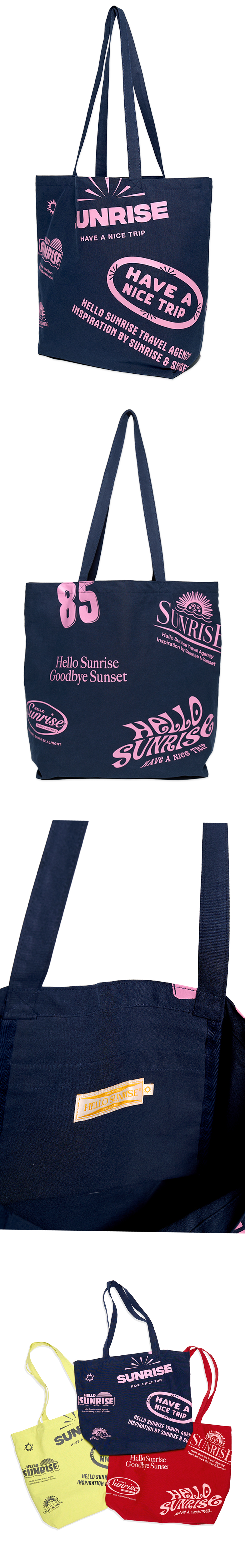 헬로선라이즈 그래픽 물이 풀 프린팅된 코튼백입니다. - 전면과 후면에 헬로선라이즈 시즌 그래픽 사용 - 내부 포켓으로 높은 활용도 - 넉넉한 사이즈로 수납에 용이 - 10수 바이오 원단으로 가볍고 부드러운 소재의 코튼백 * 바이오 원단에 풀 프린팅된 제품으로 물 빠짐이 있을 수 있습니다. * 세탁방법 - 세탁시 찬물로 단독 세탁 권장 - 중성세제 사용 및 표백제 사용 X - 자연 건조 권장 (건조기 사용 X) * Cotton 100% / Made in Korea