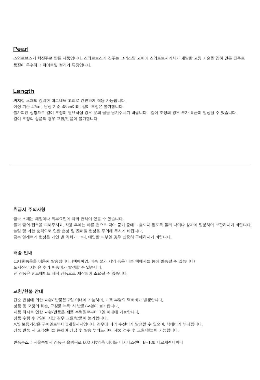 NiRO의 모든 제품은 핸드메이드로 주문후 10일 이내에 걸쳐 주문제작됩니다. 옵션 주문제작시 원하는 길이 배송메시지에 기재해주세요. 여성기준 42cm / 남성기준 48cm 스와로브스키 핵진주로 만든 제품입니다. 스와로브스키 진주는 크리스탈 코어에 스와로브시키사가 개발한 코팅 기술을 입혀 만든 진주로 모조진주이지만 품질이 우수하고 화이트빛 컬러가 특징입니다.