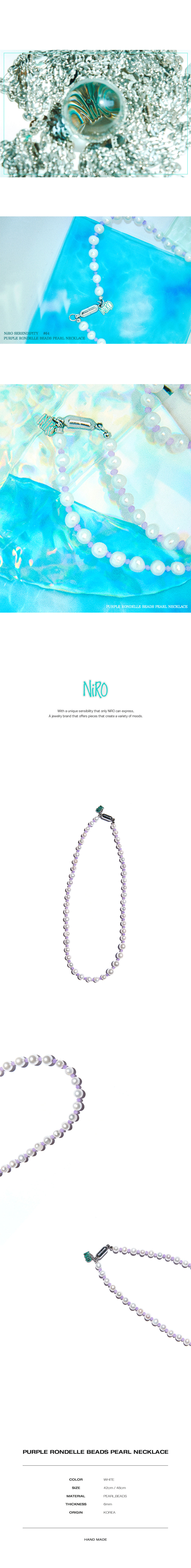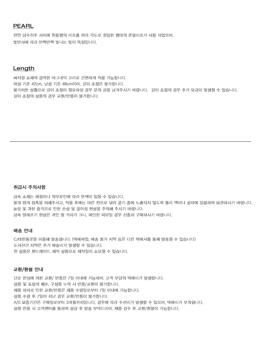 NiRO의 모든 제품은 핸드메이드로 주문후 10일 이내에 걸쳐 주문제작됩니다. 옵션 주문제작시 원하는 길이 배송메시지에 기재해주세요. 여성기준 42cm / 남성기준 48cm 천연 담수진주 사이에 원통형의 비즈를 여러 각도로 컷팅한 형태의 론델비즈가 사용되었으며, 빛반사에 따라 반짝반짝 빛나는 빛이 특징입니다.
