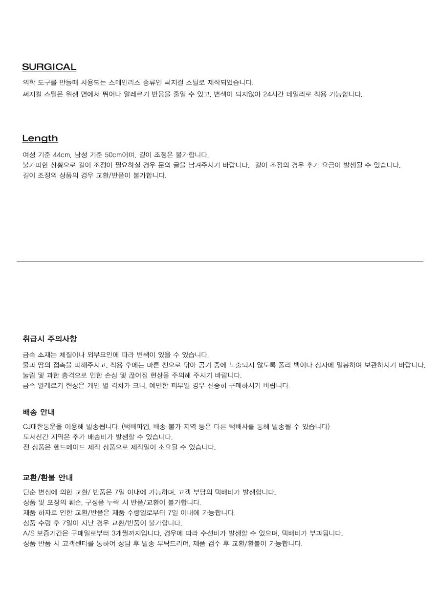 NiRO의 모든 제품은 핸드메이드로 주문후 4~5일에 걸쳐 주문제작됩니다. 옵션 주문제작시 원하는 길이 배송메시지에 기재해주세요. 여성기준 44cm / 남성기준 50cm 의학 도구를 만들 때 사용되는 스테인리스 종류인 써지컬 스틸로 제작되었습니다. 써지컬 스틸은 위생 면에서 뛰어나 알레르기 반응을 줄일 수 있고, 변색이 되지 않아 24시간 데일리로 착용 가능합니다. 앞,뒤 2가지 버전으로 착용 가능한 2WAY 제품입니다