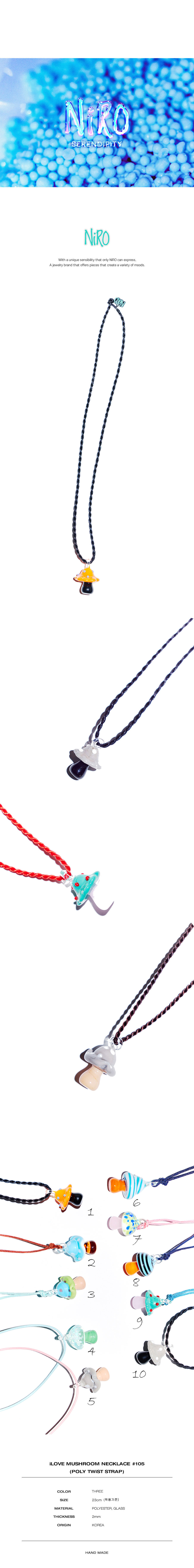 NiRO의 모든 제품은 핸드메이드로 주문후 10일 이내 걸쳐 주문제작됩니다. 폴리소재 TWiST STRAP(착용시 길이 23CM)에 GLASS MUSHROOM 참을 매달아서 포인트를 준 목걸이 입니다. 다른모양의 버섯을 원하신다면 주문제작 선택하신후 주문사항에 요청해주세요. (추가비용이 발생합니다)