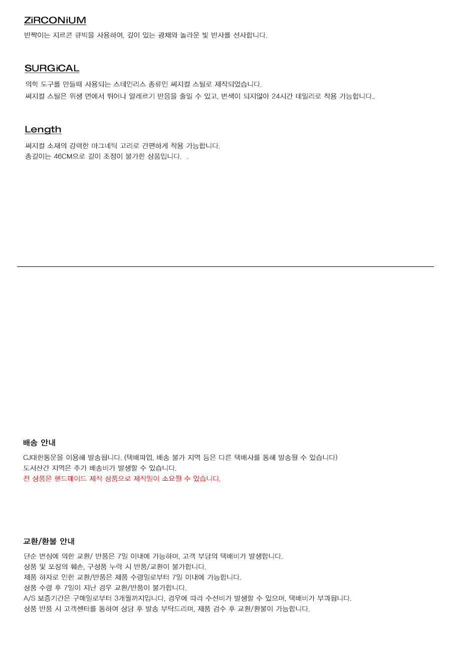NiRO의 모든 제품은 핸드메이드로 주문후 10일 이내에 걸쳐 주문제작됩니다. 일반 큐빅보다 훨씬 더 선명하고 반짝이는 지르콘 큐빅을 사용하여, 깊이 있는 광채와 놀라운 빛 반사를 선사합니다.