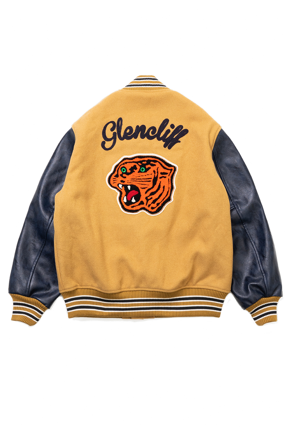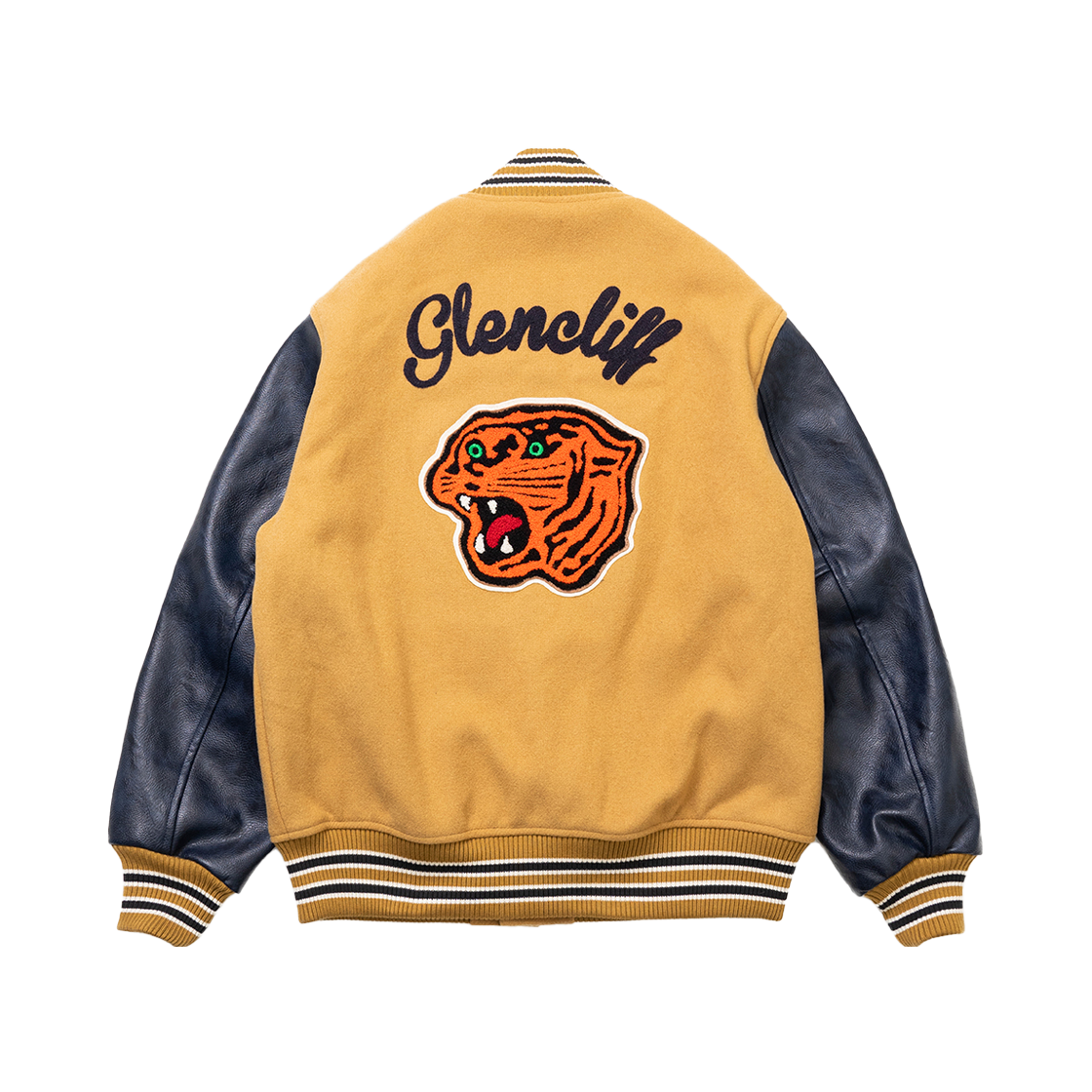 Houston Japan 51375 Melton Award Jacket (Tiger) - Camel 두꺼운 헤비멜튼을 사용하여 제작된 스타디움 자켓입니다. 소매에는 합성피혁을 사용 하였으며, 프론트 양측으로 야구공과 알파벳 'H자'의 와펜이 특징입니다. 뒷판의 텍스트는 체인 자수로 마감하였으며, 신축성있는 넥카라는 3줄 배색 라인으로 디자인되었습니다. 후면부 역시 호랑이 얼굴 와펜이 위치해 있습니다. 포켓은 코듀로이 원단을 사용하였으며, 안감에는 밝은 골드 색상의 퀼트 안감으로 제작하였습니다. 내부에는 왼쪽 가슴에 포켓과 브랜드 네임이 배치되어 있습니다. 착용시 'XL 사이즈'가 100-103, 'XXL 사이즈'가 '105-108' 정도입니다.