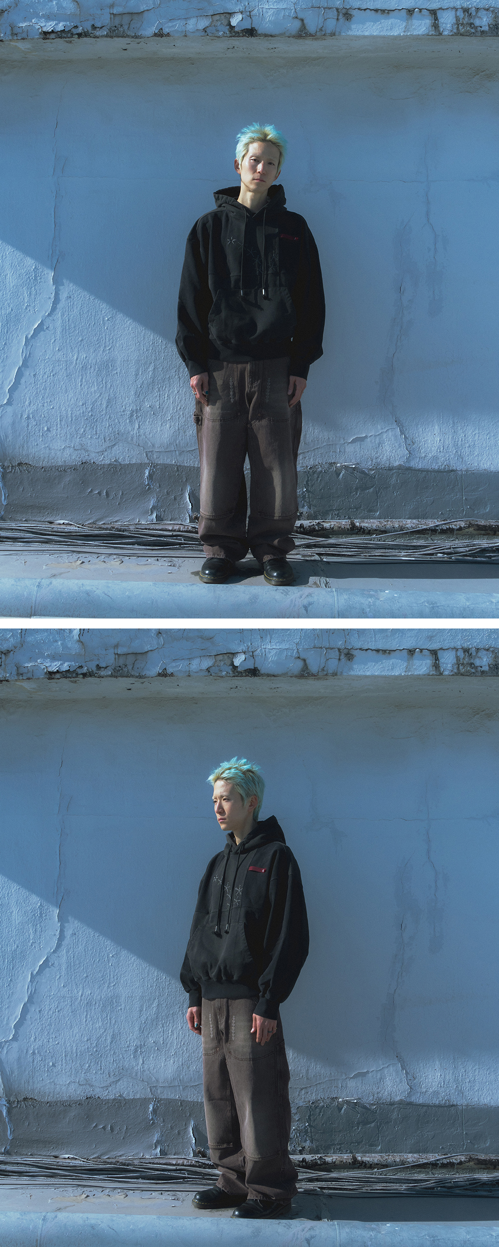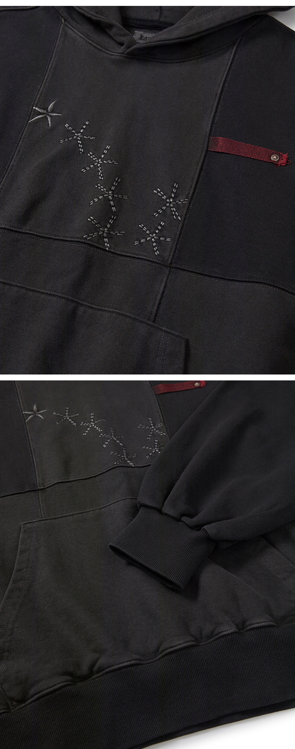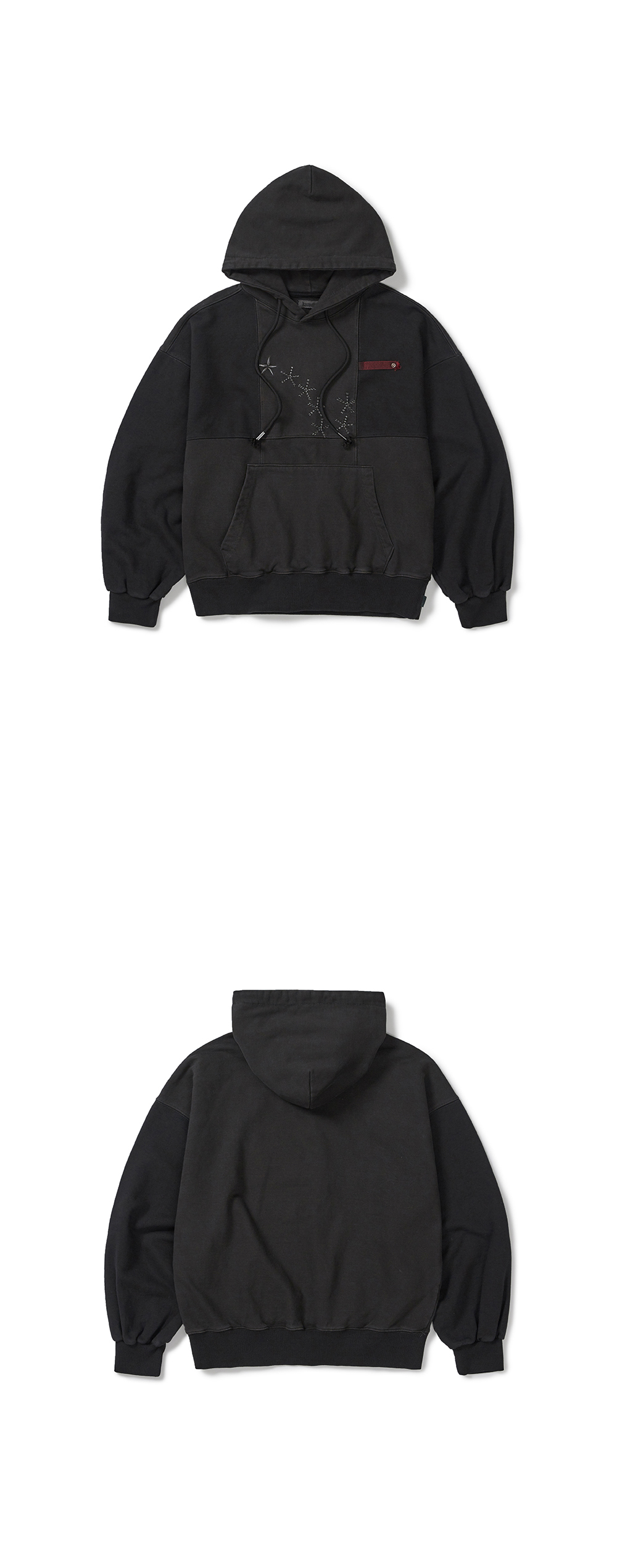 Product Info. - 750g 헤비쮸리 원단을 가공하여, 탄탄하지만 소프트한 스킨십의 원단 - 여유 있는 오버핏 실루엣과 경쾌한 크롭 기장감의 후드 티셔츠 - 깊은 컬러감과 스티치 구간의 빈티지한 텍스처 연출을 위한 피그먼트 다잉 가공 - 감각적인 패널 구조와 컬러 블럭 디자인 - 전면 심볼 로고를 재해석한 복합 자수 포인트 - 전면 좌측 레드 컬러 키 링 루프, ykk 리벳 포인트 - 러프한 무드의 스트링 디테일
