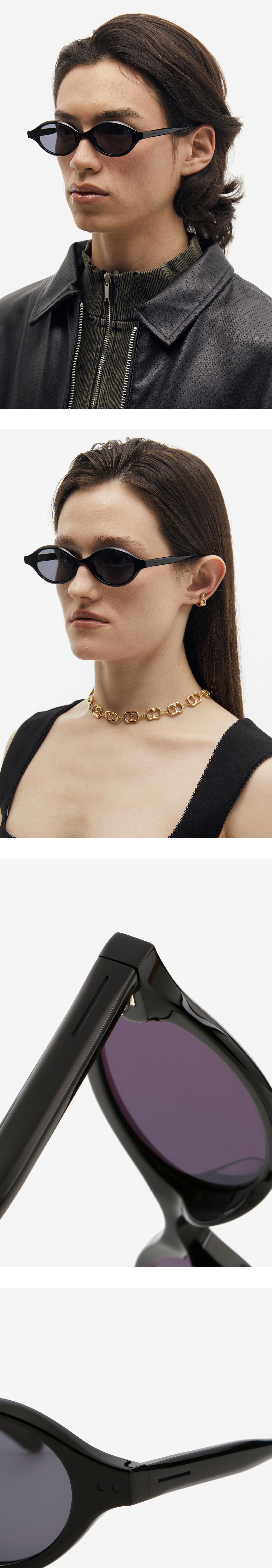 커다란 물결의 유기적인 라인을 간결한 실루엣으로 완성한 오벌 아세테이트 선글라스. 크고 작은 곡선들의 조합 안에 네 가지 다른 컬러 에나멜로 위트를 가미해 유쾌한 무드를 완성했습니다.