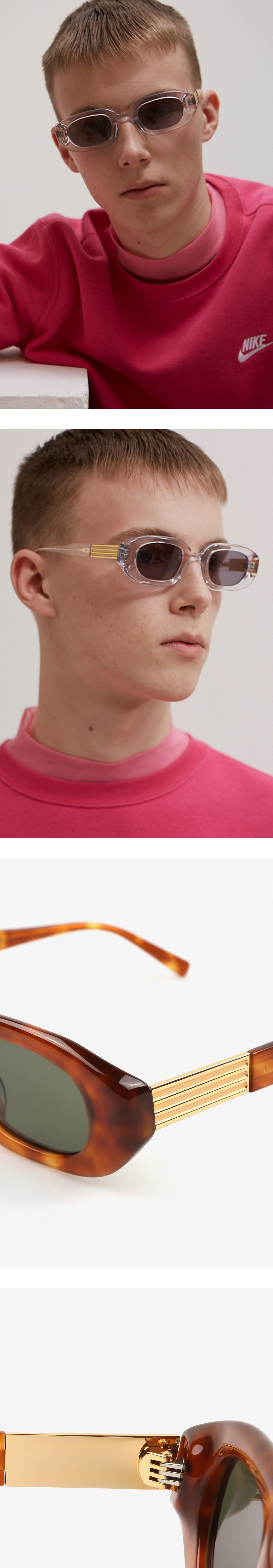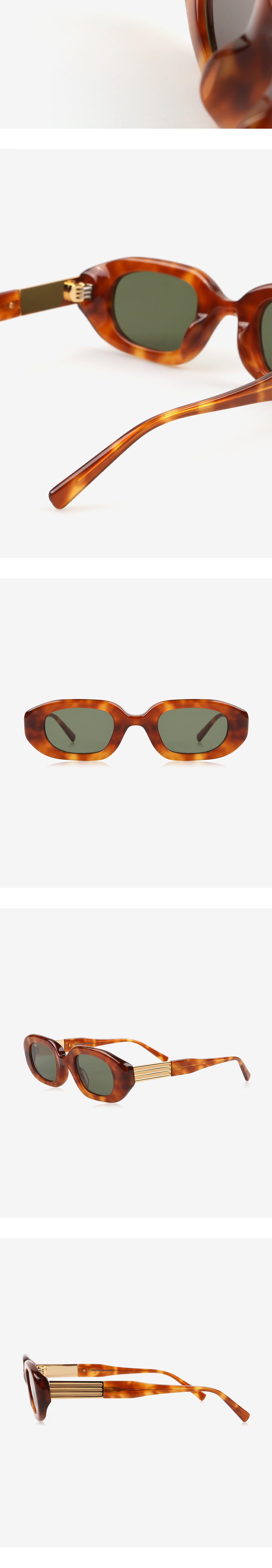 볼드하고 대담한 안구 디자인을 아세테이트로 표현하되 가장자리의 모양과 두께를 입체감있게 처리하여 과하지 않음을 의도하고, 다리와 연결되는 부분은 안구와 대비되는 금속을 사용하여 컬러와 소재가 주는 대비가 인상적인 제품입니다.