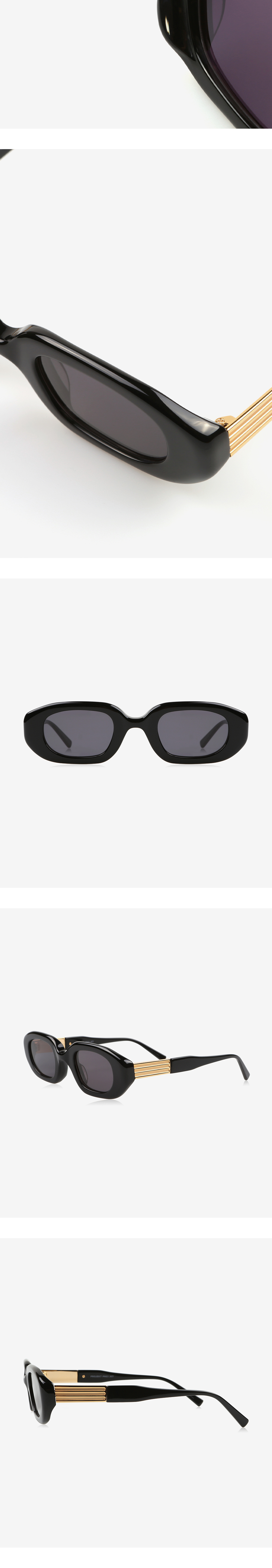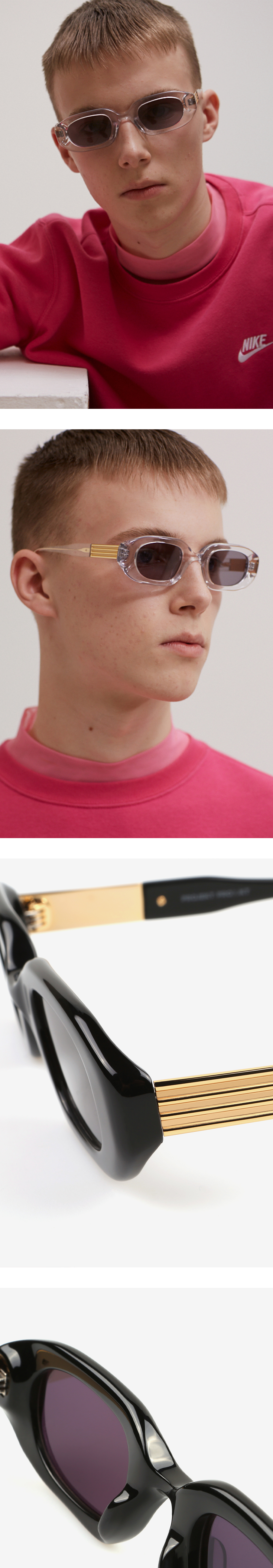 볼드하고 대담한 안구 디자인을 아세테이트로 표현하되 가장자리의 모양과 두께를 입체감있게 처리하여 과하지 않음을 의도하고, 다리와 연결되는 부분은 안구와 대비되는 금속을 사용하여 컬러와 소재가 주는 대비가 인상적인 제품입니다.
