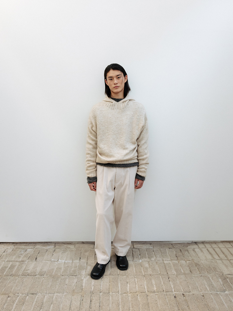 부드러운 터치감의 코듀로이 원단으로 제작한 팬츠입니다. 여유있는 테이퍼드 핏의 세미 크롭 기장의 팬츠로, 프론트에 깊은 턱 디테일을 더해 편안한 착용감을 제공합니다. 백 아웃포켓과 단추로 포인트를 더했습니다. 로고 각인된 소뿔 단추로 마무리하였습니다. 46허리 39.5CM 허벅지 36.5CM 앞밑위 34CM 총장 100.5CM 48허리 42CM 허벅지 38CM 앞밑위 35CM 총장 101.5CM 50허리 44.5CM 허벅지 39.5CM 앞밑위 36CM 총장 102.5CM 치수는 재는 위치에 따라 1-3cm 차이 생길 수 있습니다. 어두운 원단은 염색되었기 때문에 밝은 아이템과 착용 시 주의 부탁드립니다. DRY CLEAN ONLY 182 마른 체형 모델 (48 사이즈 착용)